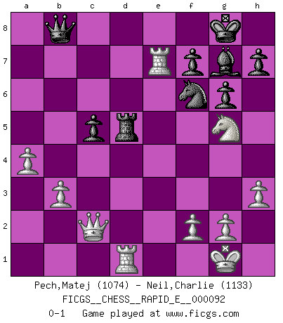 Last move : 0-1 2013 April 1 3:18:56 [Event "FICGS__CHESS__RAPID_E__000092"] [Site "FICGS"] [Date "2012.12.09"] [Round "1"] [White "Pech,Matej"] [Black "Neil,Charlie"] [Result "0-1"] [WhiteElo "1074"] [BlackElo "1133"] 1.d4 Nf6 2.c4 c5 3.d5 b5 4.cxb5 a6 5.bxa6 Bxa6 6.Nc3 d6 7.Nf3 g6 8.e4 Bg7 9.Bxa6 Rxa6 10.O-O Nbd7 11.a4 O-O 12.Qc2 Nb6 13.Re1 Qc7 14.b3 Rfa8 15.Bb2 Rb8 16.Nb5 Qd7 17.h3 Na8 18.Rad1 Nc7 19.Nxc7 Qxc7 20.e5 dxe5 21.Bxe5 Qb6 22.Bxb8 Qxb8 23.Rxe7 Rd6 24.Ng5 Rxd5 0-1 Benko gambit accepted Kingside Castling by player White (move 10) Kingside Castling by player Black (move 11) Player Black won this chess game. Follow this game move after move (download)If your opponent cannot do anything active, then don't rush the position; instead you should let him sit there, suffer, and beg you for a draw. (Jeremy Silman) Privat ist Kortschnoi kein schlechter Mensch, sehr sympathisch. Aber während des Spiels ist er grausam. Er will dich töten. (Miguel Najdorf) Una victoria por una combinación errónea, aunque sea espectacular, me llena de horror artístico. (Wilhelm Steinitz) Les échecs, c'est la lutte contre l'erreur. (Johannes Zukertort) Shallow men believe in luck. Strong men belive in cause and effect. (Ralph Waldo Emerson)
