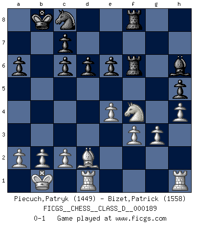 Last move : 0-1 2013 May 25 11:22:0 [Event "FICGS__CHESS__CLASS_D__000189"] [Site "FICGS"] [Date "2012.12.11"] [Round "1"] [White "Piecuch,Patryk"] [Black "Bizet,Patrick"] [Result "0-1"] [WhiteElo "1449"] [BlackElo "1558"] 1.e4 e5 2.d4 exd4 3.Qxd4 Nc6 4.Qe3 d6 5.Nc3 g6 6.Bd2 Bg7 7.O-O-O Nge7 8.h4 h5 9.Nf3 Bg4 10.Ne2 Qd7 11.Kb1 O-O-O 12.Ng5 Rhf8 13.f3 Be6 14.Nf4 Kb8 15.g3 Nc8 16.Ngxe6 fxe6 17.Nxg6 Rf6 18.Nf4 Bh6 19.Bb5 a6 20.Qc3 Rdf8 21.Bxc6 Qxc6 22.Qxc6 bxc6 0-1 This chess game has been lost on time (started : 2012.12.11 0:58:50) Centre game : Paulsen attack Queenside Castling by player White (move 7) Queenside Castling by player Black (move 11) Player Black won this chess game. Follow this game move after move (download)You need not play well - just help your opponent to play badly. (Genrikh Chepukaitis) Ich hatte meine größten Erfolge, als ich 47 Jahre alt war. Kasparow war noch nicht mal 42 und hat das Schach schon im Stich gelassen. (Viktor Kortschnoi) El Ajedrez detiene a su maestro dentro de sus propios vínculos, encadenando la mente y el cerebro, por lo que la libertad interior del mas fuerte debe sufrir. (Albert Einstein) Le génie consiste à savoir transgresser les règles au moment opportun. (Teichmann) It's not enough to succeed. Others must fail. (Gore Vidal)