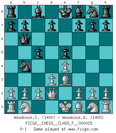 Last move : 0-1 2007 March 24 20:1:5 [Event "FICGS__CHESS__CLASS_F__000025"] [Site "FICGS"] [Date "2007.01.19"] [Round "1"] [White "Woodcock,Christine"] [Black "Woodcock,Graham"] [Result "0-1"] [WhiteElo "1400"] [BlackElo "1400"] 1.e4 c5 2.d3 Nc6 3.Bf4 e5 4.Be3 Nb4 5.Qd2 Qb6 0-1 This chess game has been lost on time (started : 2007.01.19 18:49:8) Sicilian defense Player Black won this chess game. Follow this game move after move (download)Any material change in a position must come about by mate, a capture, or a Pawn promotion. (Purdy) Wie ich sie so einen nach dem anderen nieder mähte wurde meine Überlegenheit offensichtlich. (José Raúl Capablanca) El Ajedrez es una hermosa aventura. (Bent Larsen) Des points faibles ou des trous dans la position de l'adversaire doivent être occupés par des pièces et non pas par des pions. (Siegbert Tarrasch) Work expands to fill the time available. (C. Northcote Parkinson, in Parkinson's Laws)
