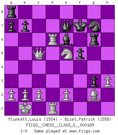 Last move : 1-0 2013 March 21 9:20:19 [Event "FICGS__CHESS__CLASS_D__000189"] [Site "FICGS"] [Date "2012.12.11"] [Round "1"] [White "Plunkett,Louis"] [Black "Bizet,Patrick"] [Result "1-0"] [WhiteElo "1554"] [BlackElo "1558"] 1.f4 e5 2.fxe5 d6 3.exd6 Bxd6 4.Nf3 g5 5.g3 h5 6.d4 h4 7.Bxg5 Be7 8.Bxe7 Qxe7 9.Qd3 hxg3 10.h3 Nf6 11.Nbd2 Nh5 12.Ne5 Nd7 13.O-O-O Nxe5 14.dxe5 Qxe5 15.Nf3 Qe7 16.Qd4 Rg8 17.Bg2 Be6 18.Kb1 c5 19.Qe5 f5 20.Rd6 Rg6 21.Rhd1 Ng7 22.Qxc5 Kf7 23.Ne5+ 1-0 Bird : From gambit, Lasker variation Queenside Castling by player White (move 13) Player White won this chess game. Follow this game move after move (download)The game of Chess is not merely an idle amusement; several very valuable qualities of the mind are to be acquired and strengthened by it, so as to become habits ready on all occasions; for life is a kind of Chess. (Benjamin Franklin) Die Neutralität betrachte ich als eine schwere Krankheit. (Viktor Kortschnoi) Un juego de Ajedrez es un dialogo, una conversación entre un jugador y su oponente. Cada movimiento del oponente puede contener amenazas o tropiezos, pero un jugador no se puede defender de las amenazas o tomar ventaja de los tropiezos si es que no se pregunta a sí mismo: ¿Que es lo que mi oponente va a hacer después de cada movida?. (Bruce A. Moon) Je ne crois pas en la psychologie, je crois aux bons coups. (Robert Fischer) A belief is an idea the mind possesses, an idea that possesses the mind. (Robert Oxden Bolton)