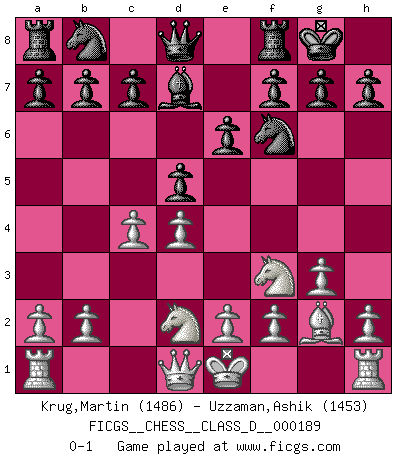 Last move : 0-1 2013 January 22 0:39:53 [Event "FICGS__CHESS__CLASS_D__000189"] [Site "FICGS"] [Date "2012.12.11"] [Round "1"] [White "Krug,Martin"] [Black "Uzzaman,Ashik"] [Result "0-1"] [WhiteElo "1486"] [BlackElo "1453"] 1.Nf3 d5 2.d4 Nf6 3.c4 e6 4.g3 Bb4+ 5.Bd2 Bxd2+ 6.Nbxd2 O-O 7.Bg2 Bd7 0-1 This chess game has been lost on time (started : 2012.12.11 0:58:50) Reti Opening Kingside Castling by player Black (move 6) Player Black won this chess game. Follow this game move after move (download)The stomach is an essential part of the Chess master. (Bent Larsen) Ein Schachgenie ist jemand der verdammt gut Schach spielt. (Jonathan Levitt) Por tratar de evitar la pérdida de una pieza, muchas personas han perdido una partida de Ajedrez. (Savielly Tartakover) Il n'y a pas eu de défaite parce que je ne crois pas que cet ordinateur ait jamais existé. IBM a triché en refusant d'imprimer les modes de recherche de la machine. C'est évident, pendant le match, des coups décisifs ont été joués par des êtres humains. Aujourd'hui, les meilleurs spécialistes en informatique ne peuvent toujours pas expliquer comment Deep-Blue a pu jouer contre la logique des ordinateurs. IBM a gagné une guerre de communication, mais ils sont incapables de prouver que l'ordinateur a gagné tout seul. (Garry Kasparov) Those who make the worst use of their time are the first to complain of its brevity. (Jean de la Bruyere)