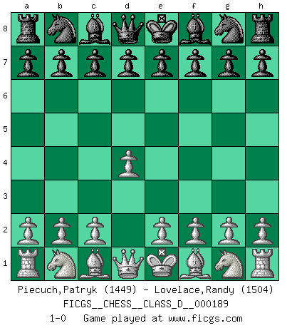 Last move : 1-0 2013 January 22 12:41:31 [Event "FICGS__CHESS__CLASS_D__000189"] [Site "FICGS"] [Date "2012.12.11"] [Round "1"] [White "Piecuch,Patryk"] [Black "Lovelace,Randy"] [Result "1-0"] [WhiteElo "1449"] [BlackElo "1504"] 1.d4 1-0 This chess game has been lost on time (started : 2012.12.11 0:58:50) Queen's pawn Player White won this chess game. Follow this game move after move (download)Fischer is under obligation to nobody. (Joseph Platz) Man gibt nur Pakete auf. (Paul Keres) Una buena ofensiva y una buena defensa, comienzan ambas con un buen desarrollo. (Bruce A. Moon) Nous vivons dans un monde échiquéen : chaque jour qui passe est un défi à relever. (Philosophe Sasha) The Internet is the first thing that humanity has build that humanity doesn't understand, the largest experiment in anarchy that we have ever had. (Eric Schmidt)