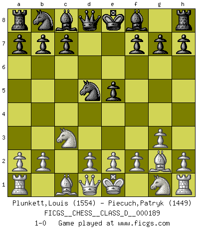 Last move : 1-0 2013 February 4 1:46:43 [Event "FICGS__CHESS__CLASS_D__000189"] [Site "FICGS"] [Date "2012.12.11"] [Round "1"] [White "Plunkett,Louis"] [Black "Piecuch,Patryk"] [Result "1-0"] [WhiteElo "1554"] [BlackElo "1449"] 1.c4 e5 2.g3 Nf6 3.Bg2 d5 4.cxd5 Nxd5 5.Nc3 1-0 This chess game has been lost on time (started : 2012.12.11 0:58:50) English Opening Player White won this chess game. Follow this game move after move (download)Excellence at Chess is one mark of a scheming mind. (Sir Arthur Conan Doyle) Bis jetzt ist Weiß einer wohlbekannten Analyse gefolgt. Aber jetzt begeht er einen schrecklichen Fehler: Er beginnt seinen eigenen Kopf zu benutzen. (Siegbert Tarrasch) Ser exitoso en el Ajedrez te permite descubrir tu propia personalidad. Eso es lo que deseo para los niños de mi clase. (Saudin Robovic) Les échecs sont utiles à l'exercice de la faculté de penser et à celle de l'imagination. Car nous devons posséder une méthode élaborée pour atteindre des buts partout où nous devons conduire notre raison. (Leibnitz) Hold em is to stud what chess is to checkers. (Johnny Moss)