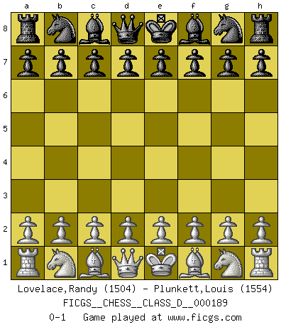 Last move : 0-1 2013 January 20 12:37:25 [Event "FICGS__CHESS__CLASS_D__000189"] [Site "FICGS"] [Date "2012.12.11"] [Round "1"] [White "Lovelace,Randy"] [Black "Plunkett,Louis"] [Result "0-1"] [WhiteElo "1504"] [BlackElo "1554"] 0-1 This chess game has been lost on time (started : 2012.12.11 0:58:50) Player Black won this chess game. Follow this game move after move (download)The enormous mental resilience, without which no Chess player can exist, was so much taken up by Chess that he could never free his mind of this game. (Albert Einstein) Ein Gewinn durch eine ungenaue Kombination, sei sie auch noch so vorzeigbar, erfüllt mich mit Schaudern. (Wilhelm Steinitz) Observen a Garry Kasparov. Después de una derrota, invariablemente el gana la próxima partida. Prácticamente hace pedazos a su siguiente oponente. Eso es algo que tenemos que aprender a lograr. (Maurice Ashley) Le thème de l'attaque double intervient d'une manière ou d'une autre dans l'immense majorité des combinaisons. (Youri Averbakh) An expert is a man who has made all the mistakes which can be made in a very narrow field. (Niels Bohr)