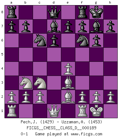Last move : 0-1 2013 February 17 7:38:51 [Event "FICGS__CHESS__CLASS_D__000189"] [Site "FICGS"] [Date "2012.12.11"] [Round "1"] [White "Pech,Jaroslav senior"] [Black "Uzzaman,Ashik"] [Result "0-1"] [WhiteElo "1429"] [BlackElo "1453"] 1.e4 c5 2.Nf3 g6 3.d4 cxd4 4.Nxd4 Nc6 5.Nc3 Bg7 6.Be3 Nf6 7.Be2 O-O 8.O-O d6 9.Nb3 Bd7 0-1 Sicilian : Hungarian variation Kingside Castling by player Black (move 7) Kingside Castling by player White (move 8) Player Black won this chess game. Follow this game move after move (download)The Pin is mightier than the sword. (Fred Reinfeld) Im Blitz ist es einfacher mit einer Figur weniger anzugreifen, als sich mit einer Mehrfigur zu verteidigen. (Mikhail Nekhemyevich Tal) En partidas rápidas, el Caballo es mas poderoso que el Alfil. (Vlastimil Hort) Les échecs sont un jeu par leur forme, un art par leur essence et une science par sa difficulté d'acquisition. Ils peuvent vous procurer autant de plaisir qu'un bon livre ou une belle musique, mais vous n'aurez une réelle joie que si vous arrivez à bien jouer. (Tigran Petrosian) The problem with manipulation is that people can turn on you. (Horatio Caine, C.S.I. Miami)