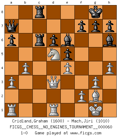 Last move : 1-0 2013 June 4 1:31:21 [Event "FICGS__CHESS__NO_ENGINES_TOURNAMENT__000060"] [Site "FICGS"] [Date "2012.12.11"] [Round "1"] [White "Cridland,Graham"] [Black "Mach,Jiri"] [Result "1-0"] [WhiteElo "1600"] [BlackElo "1010"] 1.e4 c5 2.Nf3 Nc6 3.d4 cxd4 4.Nxd4 Nf6 5.Nc3 e5 6.Ndb5 d6 7.Bg5 a6 8.Na3 b5 9.Nd5 Be7 10.Bxf6 Bxf6 11.g3 O-O 12.Bg2 Bg5 13.O-O Ne7 14.Nxe7+ Qxe7 15.c4 bxc4 16.Nxc4 Be6 17.Qd3 Rfd8 18.Rfd1 Rac8 19.Nb6 Rc6 20.Nd5 Qa7 21.h4 Bh6 22.a3 Rdc8 23.b4 1-0 Sicilian : Pelikan (Lasker/Sveshnikov) variation Kingside Castling by player Black (move 11) Kingside Castling by player White (move 13) Player White won this chess game. Follow this game move after move (download)It is no time to be playing Chess when the house is on fire. (Italian Proverb) Die Partien sind immer verschieden, die Interviews immer die gleichen. (Garry Kasparov) El Ajedrez no es una pizca de inferior al violín, y tenemos un gran número de violinistas profesionales. (Mikhail Botvinnik) Le génie consiste à savoir transgresser les règles au moment opportun. (Teichmann) The large trees attract high winds. (Chinese proverb)