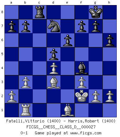 Last move : 0-1 2007 June 6 6:25:56 [Event "FICGS__CHESS__CLASS_D__000027"] [Site "FICGS"] [Date "2007.01.21"] [Round "1"] [White "Fatelli,Vittorio"] [Black "Harris,Robert"] [Result "0-1"] [WhiteElo "1400"] [BlackElo "1400"] 1.d4 d5 2.Bg5 h6 3.Bh4 c6 4.e3 Qb6 5.b3 Bf5 6.Nf3 Qa5+ 7.Qd2 Qxd2+ 8.Nbxd2 Bxc2 9.Ne5 Nd7 10.Nd3 Bxd3 11.Bxd3 e6 12.O-O Be7 13.Bg3 Ngf6 14.Rfe1 Rc8 15.Rac1 O-O 16.Nf3 c5 17.Ne5 cxd4 18.exd4 Bb4 19.Nxd7 Nxd7 20.Red1 Ba3 21.Rb1 Rc3 22.f3 Rfc8 23.Be1 Rc1 24.Rdxc1 Bxc1 25.Kf2 Bf4 0-1 Levitsky attack (Queen's Bishop attack) Kingside Castling by player White (move 12) Kingside Castling by player Black (move 15) Player Black won this chess game. Follow this game move after move (download)A bad day of Chess is better than any good day at work. (Anonymous) Frage des Reporters: -Welche besonderen Umstände rechtfertigen das Anhalten der Uhren während einer Turnierpartie? Antwort: -Einen Fotographen zu strangulieren. (Siegbert Tarrasch) Un Peón pasado aumenta su poder a medida de que el número de piezas en el tablero disminuye. (Capablanca) Toutes les manuvres exécutées sur une colonne ouverte ont pour but ultime l'intrusion définitive sur la septième ou la huitième rangée, en plein cur de la position ennemie. (Aaron Nimzovitch) The greatest con, that he ever pulled... was making you believe... that he is you. (Revolver, movie)