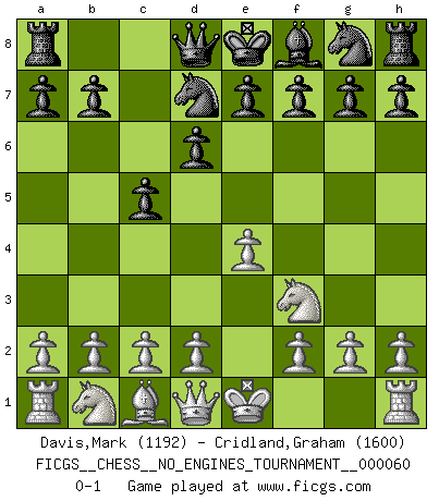 Last move : 0-1 2013 January 24 1:24:58 [Event "FICGS__CHESS__NO_ENGINES_TOURNAMENT__000060"] [Site "FICGS"] [Date "2012.12.11"] [Round "1"] [White "Davis,Mark"] [Black "Cridland,Graham"] [Result "0-1"] [WhiteElo "1192"] [BlackElo "1600"] 1.e4 c5 2.Nf3 d6 3.Bb5+ Bd7 4.Bxd7+ Nxd7 0-1 This chess game has been lost on time (started : 2012.12.11 1:58:46) Sicilian : Canal-Sokolsky attack, 3...Bd7 Player Black won this chess game. Follow this game move after move (download)Nowadays, when you're not a grandmaster at 14, you can forget about it. (Anand Viswanathan) Ich habe die besten Aussichten, den ersten Preis zu gewinnen - denn jeder muss gegen Steinitz spielen, nur ich nicht! (Wilhelm Steinitz) El estómago es una parte esencial del maestro de Ajedrez. (Bent Larsen) On n'a jamais que l'âge auquel on a commence à jouer aux échecs car après on cesse de vieillir. (Capablanca) The Internet is the world's largest library. It's just that all the books are on the floor. (John Allen Paulos)