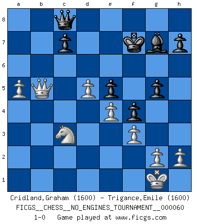 Last move : 1-0 2013 February 6 13:49:43 [Event "FICGS__CHESS__NO_ENGINES_TOURNAMENT__000060"] [Site "FICGS"] [Date "2012.12.11"] [Round "1"] [White "Cridland,Graham"] [Black "Trigance,Emile"] [Result "1-0"] [WhiteElo "1600"] [BlackElo "1600"] 1.d4 Nf6 2.c4 g6 3.Nc3 Bg7 4.Nf3 d6 5.e4 Nbd7 6.Be2 O-O 7.O-O e5 8.d5 Nc5 9.Nd2 Ne8 10.b4 Nd7 11.Ba3 b6 12.Rc1 Bb7 13.c5 bxc5 14.bxc5 Nxc5 15.Bxc5 dxc5 16.Qb3 Rb8 17.Qa3 a6 18.Qxc5 Nd6 19.Nc4 Qd7 20.Na5 f5 21.f3 f4 22.Nxb7 Nxb7 23.Qf2 Nd6 24.Bxa6 Rb6 25.Bd3 Rfb8 26.a4 Rb2 27.Rc2 Rxc2 28.Qxc2 g5 29.Rb1 Rxb1+ 30.Qxb1 Kf7 31.Bb5 Nxb5 32.Qxb5 Qc8 33.a5 1-0 King's Indian defense, 3.Nc3 Kingside Castling by player Black (move 6) Kingside Castling by player White (move 7) Player White won this chess game. Follow this game move after move (download)The Pawns are the soul of the game. (Francois Andre Danican Philidor) Wenn es im Universum noch irgendwo intelligente Lebewesen gibt, dann kennen sie Go. (Emanuel Lasker) Las leyes del Ajedrez no permiten una libre elección: tienes que mover quieras o no. (Emanuel Lasker) Il (Jacob Murray) ne joue pas pour le bon coup, mais pour le meilleur. (Eloi Relange) If you don't practice you don't deserve to win. (Andre Agassi)