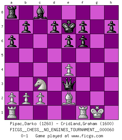 Last move : 0-1 2013 January 3 20:27:40 [Event "FICGS__CHESS__NO_ENGINES_TOURNAMENT__000060"] [Site "FICGS"] [Date "2012.12.11"] [Round "1"] [White "Pipac,Darko"] [Black "Cridland,Graham"] [Result "0-1"] [WhiteElo "1260"] [BlackElo "1600"] 1.e4 c5 2.Nf3 Nc6 3.d4 cxd4 4.Nxd4 Nf6 5.Nc3 e6 6.Bg5 Qc7 7.Bxf6 gxf6 8.h3 a6 9.Be2 Rg8 10.g3 Bh6 11.Qd3 Nxd4 12.Qxd4 Ke7 13.O-O Rxg3+ 14.fxg3 Qxg3+ 15.Kh1 Qxh3+ 16.Kg1 Be3+ 17.Qxe3 Qxe3+ 0-1 Sicilian defense Kingside Castling by player White (move 13) Player Black won this chess game. Follow this game move after move (download)We don't really know how the game was invented, though there are suspicions. As soon as we discover the culprits, we'll let you know. (Bruce Pandolfini) Um dein Spiel zu verbessern musst du zuallererst das Endspiel studieren, denn diese kann unabhängig studiert werden. Die Eröffnung und das Mittelspiel müssen immer in Bezug gesetzt werden zum Endspiel. (José Raúl Capablanca) Ciertamente el estado mental actual de Bobby Fischer es una tragedia. Uno de los mas grandes jugadores de Ajedrez del mundo -el orgullo y pena del Ajedrez Americano. (Frank Brady) Même si l'adversaire joue le coup analysé précédemment, recommencez l'analyse en voyant la nouvelle position. Première règle de Blumenfeld Have no fear of perfection - you'll never reach it. (Salvador Dali)
