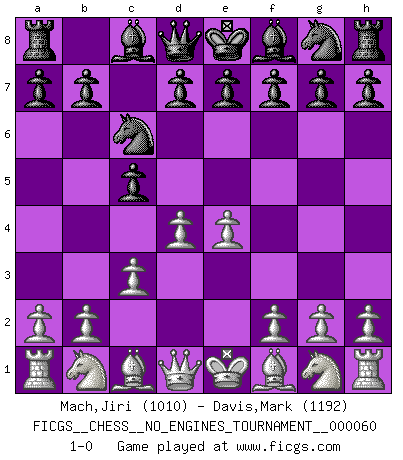 Last move : 1-0 2013 February 24 4:15:20 [Event "FICGS__CHESS__NO_ENGINES_TOURNAMENT__000060"] [Site "FICGS"] [Date "2012.12.11"] [Round "1"] [White "Mach,Jiri"] [Black "Davis,Mark"] [Result "1-0"] [WhiteElo "1010"] [BlackElo "1192"] 1.e4 c5 2.c3 Nc6 3.d4 1-0 This chess game has been lost on time (started : 2012.12.11 1:58:46) Sicilian : Alapin's variation (2.c3) Player White won this chess game. Follow this game move after move (download)Man is a frivolous, a specious creature, and like a Chess player, cares more for the process of attaining his goal than for the goal itself. (Dostoyevsky) Es macht mich traurig, wenn ich sehe, dass Golfprofis mehr verdienen als Schachsportler. Obwohl ich davon überzeugt bin, dass wir Schachspieler viel härter trainieren müssen als die Golfer. (Alexandra Kosteniuk) El sobresalir en el Ajedrez es un signo de una mente intrigante. (Sir Arthur Conan Doyle) Le joueur d'Echecs qui veut atteindre le top est obligé de développer son propre credo créatif. Alexeï Stepanovicth Souétine. Il est facile d'écrire des livres ! Ce qui est difficile, c'est de jouer ! (Alexeï Stepanovicth Souétine) Just because you do not take an interest in politics doesn't mean politics won't take an interest in you. (Pericles 430 B.C.)