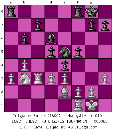 Last move : 1-0 2013 June 4 1:31:29 [Event "FICGS__CHESS__NO_ENGINES_TOURNAMENT__000060"] [Site "FICGS"] [Date "2012.12.11"] [Round "1"] [White "Trigance,Emile"] [Black "Mach,Jiri"] [Result "1-0"] [WhiteElo "1600"] [BlackElo "1010"] 1.b4 e5 2.Bb2 f6 3.a3 d5 4.e3 Be6 5.d3 Nd7 6.Nf3 a5 7.c3 axb4 8.cxb4 Bd6 9.Be2 Nh6 10.h3 O-O 11.O-O Qe7 12.Nbd2 Nb6 13.Rc1 Nf7 14.Nb3 Na4 15.Qc2 b6 16.Nfd2 Nxb2 17.Qxb2 f5 18.Nf3 e4 19.Nfd4 Bd7 20.Nc6 Bxc6 21.Rxc6 Qe5 22.Qxe5 Nxe5 23.Rc3 1-0 Polish (Sokolsky) opening Kingside Castling by player Black (move 10) Kingside Castling by player White (move 11) Player White won this chess game. Follow this game move after move (download)The laws of Chess do not permit a free choice: you have to move whether you like it or not. (Emanuel Lasker) Die Auseinandersetzung mit Karpow war politisch geprägt. Er stand für das kommunistische System, wurde von dessen Repräsentanten gehätschelt. Ich war der Oppositionelle. Jeder Schachweltmeister spiegelt auch die gesellschaftlichen Verhältnisse wider. Kramnik steht für die Börsen-Generation des Neuen Markts, ideologiefrei, zahlenfixiert. (Garry Kasparov) El Ajedrez es parte de la cultura, y si una cultura esta en decadencia, entonces también el Ajedrez declinará. (Mikhail Botvinnik) Les Echecs mettent en conflit, non pas deux intelligences, mais deux volontés. (Lasker) All politicians must be presumed guilty until they are proven innocent. (Dinesh De Silva)