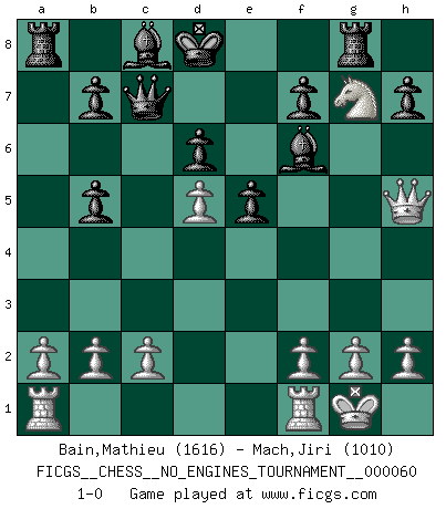Last move : 1-0 2013 May 23 11:14:40 [Event "FICGS__CHESS__NO_ENGINES_TOURNAMENT__000060"] [Site "FICGS"] [Date "2012.12.11"] [Round "1"] [White "Bain,Mathieu"] [Black "Mach,Jiri"] [Result "1-0"] [WhiteElo "1616"] [BlackElo "1010"] 1.e4 c5 2.Nf3 d6 3.Bc4 e6 4.Nc3 Nf6 5.d4 cxd4 6.Nxd4 Be7 7.Bb5+ Nbd7 8.O-O Qc7 9.Bf4 e5 10.Nd5 Nxd5 11.exd5 a6 12.Nf5 axb5 13.Nxg7+ Kd8 14.Bg3 Nf6 15.Bh4 Rg8 16.Bxf6 Bxf6 17.Qh5 1-0 This chess game has been lost on time (started : 2012.12.11 1:58:46) Sicilian Kingside Castling by player White (move 8) Player White won this chess game. Follow this game move after move (download)Chess is a terrific way for kids to build self image and self esteem. (Saudin Robovic) Wir können eben der zündenden Macht des Opfers nicht wiederstehen, denn die Begeisterung für das Opfer liegt in der Natur des Menschen. (Rudolf Spielmann) Evita las multitudes. Haz independientemente tu propio razonamiento. Trata de ser el jugador de Ajedrez, no la pieza de Ajedrez. (Ralph Charell) Le plus grand jeu de l'esprit jamais inventé, plus vous l'apprenez, plus vous y prenez du plaisir. (Garry Kasparov) At work, the authority of a person is inversely proportional to the number of pens that person is carrying. (Dan Rotaru)