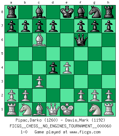 Last move : 1-0 2013 January 22 0:39:53 [Event "FICGS__CHESS__NO_ENGINES_TOURNAMENT__000060"] [Site "FICGS"] [Date "2012.12.11"] [Round "1"] [White "Pipac,Darko"] [Black "Davis,Mark"] [Result "1-0"] [WhiteElo "1260"] [BlackElo "1192"] 1.e4 e5 2.d4 exd4 3.c3 Nc6 4.Bb5 Qf6 5.Bxc6 1-0 This chess game has been lost on time (started : 2012.12.11 1:58:46) Danish gambit Player White won this chess game. Follow this game move after move (download)Chess is a forcing house where the fruits of character can ripen more fully than in life. (Edward Morgan Foster) Die Neutralität betrachte ich als eine schwere Krankheit. (Viktor Kortschnoi) Es muy difícil jugar en contra de la teoría de Einstein. - en su primera derrota en contra de Fischer (Mikhail Tal) Les réformistes prétendent que les progrès de la théorie conduiront à la disparition des échecs, et qu'il faut, pour leur rendre vie, en remanier les règles. En réalité, qu'exprime cette affirmation? Le mépris de l'intuition, de l'imagination et de tous les autres éléments qui font des échecs un art. (Alexander Alekhine) Patience, use the Force, think ! (Obi-Wan Kenobi in Star Wars ep.2)