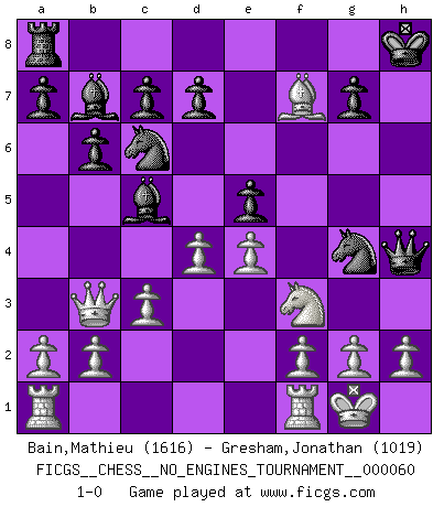 Last move : 1-0 2012 December 19 0:56:51 [Event "FICGS__CHESS__NO_ENGINES_TOURNAMENT__000060"] [Site "FICGS"] [Date "2012.12.11"] [Round "1"] [White "Bain,Mathieu"] [Black "Gresham,Jonathan"] [Result "1-0"] [WhiteElo "1616"] [BlackElo "1019"] 1.e4 e5 2.Nf3 Nc6 3.Bc4 Nf6 4.d3 Bc5 5.O-O O-O 6.c3 b6 7.Qb3 h6 8.Bg5 hxg5 9.Nxg5 Bb7 10.Nxf7 Rxf7 11.Bxf7+ Kh8 12.Nd2 Ng4 13.d4 Qh4 14.Nf3 1-0 Two knights defense (Modern Bishop's Opening) Kingside Castling by player White (move 5) Kingside Castling by player Black (move 5) Player White won this chess game. Follow this game move after move (download)Life is a kind of Chess, with struggle, competition, good and ill events. (Benjamin Franklin) Ein unbeabsichtigtes Patt ist der Gipfel der Dummheit. (Anonymous) Botvinnik trataba de restarle el misterio al Ajedrez, siempre relacionandolo a situaciones de la vida ordinaria. El gustaba de llamar al Ajedrez un típico problema inexacto similar a aquellos de los cuales la gente siempre tiene que enfrentarse en la vida cotidiana. (Garry Kasparov) Les sacrifices démontrent seulement que quelqu'un a gaffé. (Savielly Tartacover) They say poker is a zero-sum game. It must be, because every time I play my sum ends up zero. (Max Shapiro)