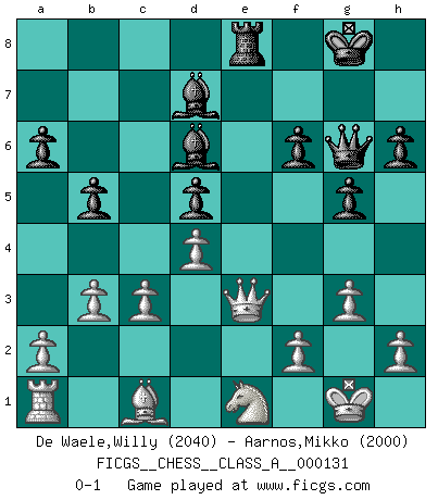 Last move : 0-1 2013 April 22 20:44:17 [Event "FICGS__CHESS__CLASS_A__000131"] [Site "FICGS"] [Date "2012.12.13"] [Round "1"] [White "De Waele,Willy"] [Black "Aarnos,Mikko"] [Result "0-1"] [WhiteElo "2040"] [BlackElo "2000"] 1.e4 e5 2.Nf3 Nc6 3.Bb5 a6 4.Ba4 Nf6 5.O-O Be7 6.Re1 b5 7.Bb3 O-O 8.c3 d5 9.exd5 Nxd5 10.Nxe5 Nxe5 11.Rxe5 c6 12.Re1 Bd6 13.d4 Qh4 14.g3 Qh3 15.Re4 g5 16.Qf3 Bf5 17.Nd2 Rae8 18.Bxd5 cxd5 19.Re3 h6 20.Qg2 Qh5 21.Qf3 Qg6 22.b3 Rxe3 23.Qxe3 Bd7 24.Nf3 f6 25.Ne1 Re8 0-1 Ruy Lopez : Closed, 7...O-O Kingside Castling by player White (move 5) Kingside Castling by player Black (move 7) Player Black won this chess game. Follow this game move after move (download)Fischer prefers to enter Chess history alone. (Miguel Najdorf) Ohne Fehler kann es keine Brillanz geben. (Emanuel Lasker) Jugadores de primera clase pierden en contra de jugadores de segunda clase porque los jugadores de segunda clase a veces juegan una partida de primer clase. (Siegbert Tarrasch) Avant la finale, les dieux ont créé le milieu de partie. (Tarrasch) I find television to be very educating. Every time somebody turns on the set, I go in the other room and read a book. (Groucho Marx)