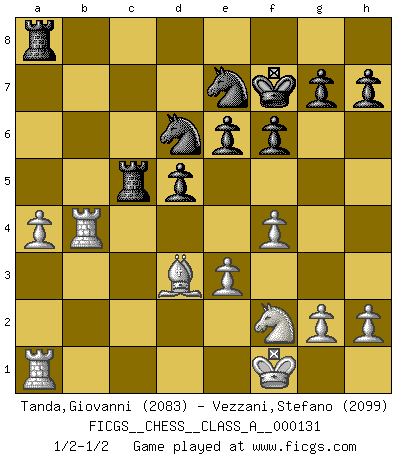 Last move : 1/2-1/2 2013 July 10 16:1:34 [Event "FICGS__CHESS__CLASS_A__000131"] [Site "FICGS"] [Date "2012.12.13"] [Round "1"] [White "Tanda,Giovanni"] [Black "Vezzani,Stefano"] [Result "1/2-1/2"] [WhiteElo "2083"] [BlackElo "2099"] 1.d4 d5 2.Bf4 c5 3.e3 Nc6 4.c3 Nf6 5.Nd2 e6 6.Bd3 Bd6 7.Bxd6 Qxd6 8.f4 Bd7 9.Nh3 Ne7 10.O-O Qb6 11.Qb3 O-O 12.Qxb6 axb6 13.Nf2 Rfc8 14.Nf3 Bc6 15.Ne5 Ne8 16.a3 f6 17.Nxc6 bxc6 18.dxc5 bxc5 19.b4 Nd6 20.a4 Kf7 21.Rfb1 cxb4 22.cxb4 c5 23.Kf1 cxb4 24.Rxb4 Rc5 1/2-1/2 Queen's pawn, Mason variation, Steinitz counter-gambit Kingside Castling by player White (move 10) Kingside Castling by player Black (move 11) This chess game ended in a draw. Follow this game move after move (download)In Chess, just as in life, today's bliss may be tomorrow's poison. (Assaic) Wie gewinnt Tal? Er entwickelt alle seine Figuren in die Brettmitte und opfert sie dann irgendwo. (Robert James Fischer) No volvere nunca a jugar contigo. Has insultado a mi amigo. - cuando un oponente se maldijo por una mala jugada (Miguel Najdorf) Ne tendez aucun piège pour le plaisir ! Ne jouez rien dans l'espoir que l'adversaire réagisse de façon stupide ! Prenez toujours pour acquis que l'adversaire va trouver le meilleur coup ! Ne jouez jamais de coup dans l'espoir que l'adversaire ne voie pas la menace ! Chacun de vos coups doit améliorer la position d'une façon ou d'une autre. Whenever people agree with me, I always feel I must be wrong. (Oscar Wilde)