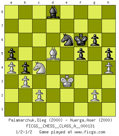 Last move : 1/2-1/2 2012 December 20 5:41:6 [Event "FICGS__CHESS__CLASS_A__000131"] [Site "FICGS"] [Date "2012.12.13"] [Round "1"] [White "Palamarchuk,Oleg"] [Black "Huerga,Aser"] [Result "1/2-1/2"] [WhiteElo "2000"] [BlackElo "2000"] 1.e4 c5 2.Nf3 d6 3.d4 cxd4 4.Nxd4 Nf6 5.Nc3 a6 6.Be3 e5 7.Nb3 Be6 8.f3 h5 9.Be2 Nbd7 10.Qd2 b5 11.a4 b4 12.Nd5 Bxd5 13.exd5 Nb6 14.f4 Nbxd5 15.Bf3 Nxe3 16.Bc6+ Nd7 17.Qxe3 Rc8 18.fxe5 Rh6 19.Be4 Be7 20.exd6 Rxd6 21.O-O Qb6 22.Qxb6 Nxb6 23.Na5 g6 24.b3 Rc3 25.Rae1 Kf8 26.Bd3 Nd7 27.Nc4 Rf6 28.Ne3 Ne5 29.Be4 Rxf1+ 30.Kxf1 Rc5 31.Bb7 a5 32.Re2 Bg5 33.Nd5 Nc6 34.Nb6 Rf5+ 35.Rf2 Rxf2+ 36.Kxf2 Nd4 37.Nc4 Bd8 38.Be4 f5 39.Ke3 Ne6 40.Bd5 Ke7 41.h4 Kf6 1/2-1/2 Sicilian : Najdorf, Byrne (English) attack Kingside Castling by player White (move 21) This chess game ended in a draw. Follow this game move after move (download)Winning isn't everything... but losing is nothing. (Mednis) Im Fernschach kannst du während dem Spiel rauchen. (John Christen Knudsen) El arma más poderosa en el Ajedrez, es tener la próxima movida. (David Bronstein) Mais l'homme est une créature légère et illogique : semblable au joueur d'échecs, il n'aime que le processus du but à atteindre, non le but lui-même. (Dostoïevsky) A specialist learns more and more about less and less until he knows everything about nothing. (Nicholas Murray Butler)