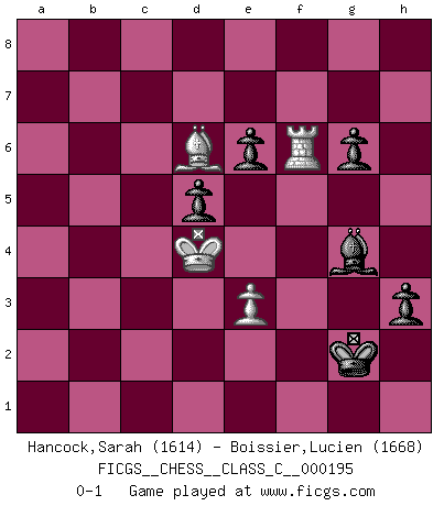 Last move : 0-1 2013 May 6 21:58:36 [Event "FICGS__CHESS__CLASS_C__000195"] [Site "FICGS"] [Date "2012.12.17"] [Round "1"] [White "Hancock,Sarah"] [Black "Boissier,Lucien"] [Result "0-1"] [WhiteElo "1614"] [BlackElo "1668"] 1.d4 d5 2.Bf4 c6 3.e3 Nf6 4.Nc3 Bf5 5.f3 e6 6.g4 Bg6 7.h4 h5 8.g5 Nfd7 9.Qd2 Bb4 10.a3 Qa5 11.Nge2 O-O 12.Bg3 c5 13.Rc1 cxd4 14.axb4 dxc3 15.bxa5 cxd2+ 16.Kxd2 Nc6 17.a6 Nde5 18.axb7 Rab8 19.Nd4 Rxb7 20.Nxc6 Nxc6 21.b3 a5 22.Ra1 Nb4 23.Rxa5 Nxc2 24.Bb5 Na3 25.Rxa3 Rxb5 26.Rc1 Re8 27.Bd6 Rd8 28.Rc6 Rb7 29.b4 Bf5 30.Rc7 Rdb8 31.Rxb7 Rxb7 32.Kc3 f6 33.Kd4 fxg5 34.hxg5 Kh7 35.Kc5 Bh3 36.b5 Bg2 37.b6 Bxf3 38.Ra4 Kg6 39.Rd4 Kxg5 40.Kc6 Rxb6+ 41.Kxb6 Be4 42.Be7+ Kg4 43.Rd1 g6 44.Rf1 Kg3 45.Rf4 Bf5 46.Kc5 Bg4 47.Kd4 h4 48.Bd6 h3 49.Rf6 Kg2 0-1 Queen's pawn, Mason variation Kingside Castling by player Black (move 11) 10 pieces endgame at move 41 : White KRBP , Black KBPPPP WHITE : King + 1 Rook 1 Bishop 1 Pawn BLACK : King + 1 Bishop 4 Pawns Player Black won this chess game. Follow this game move after move (download)Suddenly it was obvious to me in my analysis I had missed what Fischer had found with the greatest of ease at the board. (Mikhail Botvinnik) Rubinstein ist ein Turmendspiel, welches die Götter vor tausenden von Jahren begannen. (Savielly Grigorievitsch Tartakower) El Ajedrez es el juego mas altamente simbólico, pero las agresiones estan por lo tanto aún mas francamente representadas en la partida. Tal vez comenzo como un juego de guerra; Algo como la representación de una batalla en miniatura entre las fuerzas de dos reinos. (Karl Meninger) A ce moment-là, je menaçais de comprendre la position ! (Clément L'Heureux) I live to kill Traxler counterattack. (Ilmars Cirulis)