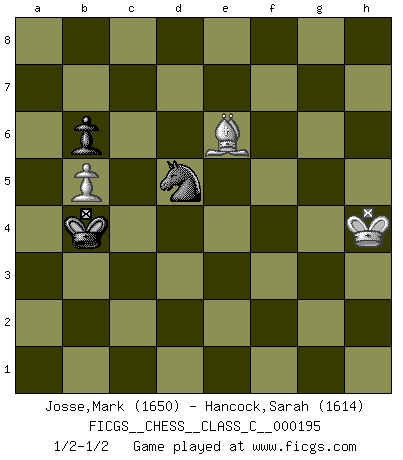 Last move : 1/2-1/2 2013 February 16 10:16:46 [Event "FICGS__CHESS__CLASS_C__000195"] [Site "FICGS"] [Date "2012.12.17"] [Round "1"] [White "Josse,Mark"] [Black "Hancock,Sarah"] [Result "1/2-1/2"] [WhiteElo "1650"] [BlackElo "1614"] 1.d4 d5 2.c4 e6 3.Nc3 c5 4.cxd5 exd5 5.Nf3 Nf6 6.g3 Be7 7.Bg2 Nc6 8.O-O O-O 9.dxc5 Bxc5 10.a3 Be6 11.b4 Be7 12.Bb2 Rc8 13.Rc1 Qd7 14.e3 h6 15.Ne2 Ne4 16.Nf4 Bf6 17.Qb3 Rfd8 18.Rfd1 Qe7 19.Rc2 Qe8 20.Bxf6 Nxf6 21.Nxe6 Qxe6 22.Rdc1 Qg4 23.Qb2 a6 24.a4 Qd7 25.Bf1 Na7 26.Ne5 Qd6 27.b5 Rxc2 28.Rxc2 axb5 29.axb5 Rc8 30.Nf3 Rxc2 31.Qxc2 Ne4 32.Nd4 Qc5 33.Qa2 Qc1 34.Kg2 Qd2 35.Qxd2 Nxd2 36.Be2 Nc8 37.h4 Kf8 38.Nf5 h5 39.Nd4 g6 40.f3 Nd6 41.Bd3 N2c4 42.Kf2 Ke7 43.Ke2 Kd7 44.g4 hxg4 45.fxg4 Ne5 46.h5 Nxg4 47.hxg6 fxg6 48.Bxg6 Kc7 49.Bc2 Ne5 50.Bh7 Kb6 51.Bg8 Ne4 52.Be6 Kc5 53.Bg8 Kc4 54.Be6 Nc3+ 55.Kf2 b6 56.Kg3 Kd3 57.Kf4 Ng6+ 58.Kf3 Nh4+ 59.Kg3 Kxe3 60.Nc2+ Kd3 61.Nb4+ Kc4 62.Nxd5 Nxd5 63.Kxh4 Kb4 1/2-1/2 QGD : Tarrasch defense Kingside Castling by player White (move 8) Kingside Castling by player Black (move 8) 10 pieces endgame at move 48 : White KBNPP , Black KNNPP WHITE : King + 1 Bishop 1 Knight 2 Pawns BLACK : King + 2 Knights 2 Pawns 9 pieces endgame at move 59 : White KBNP , Black KNNPP WHITE : King + 1 Bishop 1 Knight 1 Pawn BLACK : King + 2 Knights 2 Pawns 8 pieces endgame at move 62 : White KBNP , Black KNNP WHITE : King + 1 Bishop 1 Knight 1 Pawn BLACK : King + 2 Knights 1 Pawn 7 pieces endgame at move 62 : White KBP , Black KNNP WHITE : King + 1 Bishop 1 Pawn BLACK : King + 2 Knights 1 Pawn 6 pieces endgame at move 63 : White KBP , Black KNP WHITE : King + 1 Bishop 1 Pawn BLACK : King + 1 Knight 1 Pawn This chess game ended in a draw. Follow this game move after move (download)When the Chess game is over, the Pawn and the King go back to the same box. (Irish saying) Frage: Gibt es etwas was Sie mehr lieben als Autobahnen ohne Tempobegrenzungen? - Antwort: Deutsche Frauen ohne Tempobegrenzungen. (Loek van Wely) Después de una mala apertura, hay una esperanza en el juego medio. Pero una vez que estas en finales, el momento de la verdad ha llegado. (Edmar Mednis) Les erreurs sont comme les malheurs, elles n'arrivent jamais seules. (Siegbert Tarrasch) Don't be irreplaceable, if you can't be replaced, you can't be promoted. (Dan Rotaru)
