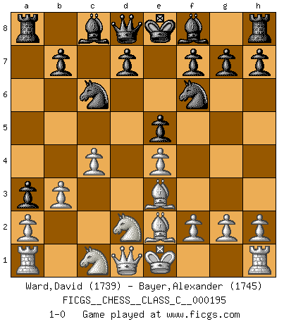 Last move : 1-0 2013 March 22 6:35:6 [Event "FICGS__CHESS__CLASS_C__000195"] [Site "FICGS"] [Date "2012.12.17"] [Round "1"] [White "Ward,David"] [Black "Bayer,Alexander"] [Result "1-0"] [WhiteElo "1739"] [BlackElo "1745"] 1.e4 c5 2.Nf3 e6 3.d4 cxd4 4.Nxd4 a6 5.Be3 Nf6 6.Nd2 e5 7.N4b3 Nc6 8.c4 a5 9.Be2 a4 10.Nc1 a3 11.b3 1-0 Sicilian : Kan variation Player White won this chess game. Follow this game move after move (download)Chess is above all, a fight ! (Emanuel Lasker) Das Schach ist nichts für kleine Geister, es beansprucht einen vollen Mann, der sich nicht sklavisch an das Überlieferte hält, sondern selbständig die Tiefen des Spiels zu ergründen sucht. (Wilhelm Steinitz) Yo considero que Fischer es uno de los expertos mas grandes de aperturas de siempre. (Keith Hayward) Ne tendez aucun piège pour le plaisir ! Ne jouez rien dans l'espoir que l'adversaire réagisse de façon stupide ! Prenez toujours pour acquis que l'adversaire va trouver le meilleur coup ! Ne jouez jamais de coup dans l'espoir que l'adversaire ne voie pas la menace ! Chacun de vos coups doit améliorer la position d'une façon ou d'une autre. It is a good thing for an uneducated man to read books of quotations. (Winston Churchill)