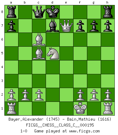 Last move : 1-0 2013 January 3 12:14:46 [Event "FICGS__CHESS__CLASS_C__000195"] [Site "FICGS"] [Date "2012.12.17"] [Round "1"] [White "Bayer,Alexander"] [Black "Bain,Mathieu"] [Result "1-0"] [WhiteElo "1745"] [BlackElo "1616"] 1.e4 e6 2.d4 d5 3.Nc3 c5 4.exd5 exd5 5.Nf3 Nc6 6.Bb5 Bd6 7.dxc5 Qe7+ 8.Be3 Bxc5 9.Nxd5 Qd6 10.Bxc5 Qe6+ 11.Kf1 Qd7 12.Ne5 Qd8 13.Nxc6 bxc6 14.Bxc6+ Bd7 15.Qe2+ Ne7 16.Bxe7 Qc8 17.Bc5 Kd8 18.Qe7+ 1-0 French : Marshall variation Player White won this chess game. Follow this game move after move (download)Place the contents of the Chess box in a hat, shake them up vigorously, pour them on the board from a height of two feet, and you get the style of Steinitz. (H. E. Bird) Spiel ein langweiliges Spiel zu Ende und lustige Dinge können passieren. (Hans Ree) Una mala movida nulifica cuarenta buenas. (Horowitz) J'ai toujours senti une vague pitié pour l'homme qui ne connaît rien aux échecs, tout comme j'en aurais pour un homme ignorant de l'amour. Les Echecs, comme la musique ou comme l'amour, ont le pouvoir de rendre heureux. (Siegbert Tarrasch) Memory... is the diary that we all carry with us. (Oscar Wilde, The Importance of Being Earnest)