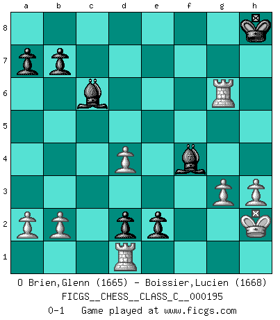 Last move : 0-1 2013 February 13 4:38:58 [Event "FICGS__CHESS__CLASS_C__000195"] [Site "FICGS"] [Date "2012.12.17"] [Round "1"] [White "O Brien,Glenn"] [Black "Boissier,Lucien"] [Result "0-1"] [WhiteElo "1665"] [BlackElo "1668"] 1.e4 c5 2.Nf3 Nc6 3.d4 cxd4 4.Nxd4 g6 5.Nc3 Bg7 6.Be3 Nf6 7.Bc4 Qa5 8.O-O O-O 9.Bb3 d6 10.h3 Bd7 11.f4 Nxd4 12.Bxd4 Bc6 13.Qd3 Rad8 14.Rad1 e6 15.f5 gxf5 16.exf5 e5 17.Be3 d5 18.Bg5 Qb6+ 19.Kh1 d4 20.Qg3 Kh8 21.Ne2 Ne4 22.Qh4 Nxg5 23.Qxg5 Rg8 24.Bxf7 Bh6 25.Qf6+ Rg7 26.Kh2 Qc7 27.Bg6 hxg6 28.fxg6 Qd6 29.c3 Qxf6 30.Rxf6 d3 31.Nc1 d2 32.Nb3 e4 33.Nd4 e3 34.Re6 Rxd4 35.cxd4 Rxg6 36.Rxg6 Bf4+ 37.g3 e2 0-1 Sicilian : Accelerated Fianchetto, Modern variation with Bc4 Kingside Castling by player White (move 8) Kingside Castling by player Black (move 8) Player Black won this chess game. Follow this game move after move (download)Via the squares on the chessboard, the Indians explain the movement of time and the age, the higher influences which control the world and the ties which link Chess with the human soul. (Al-Masudi) Moralische Siege zählen nicht. (Savielly Grigorievitsch Tartakower) Desconfianza es la característica mas necesaria de un jugador de Ajedrez. (Siegbert Tarrasch) Ce n'est pas pour s'amuser qu'il joue aux échecs : il célèbre un culte. (Vladimir Nabokov) You can only get smarter by playing a smarter opponent. (Revolver, movie)