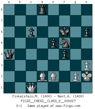 Last move : 0-1 2007 May 9 7:36:10 [Event "FICGS__CHESS__CLASS_D__000027"] [Site "FICGS"] [Date "2007.01.21"] [Round "1"] [White "Finkelstein,Michael"] [Black "Nent,Alexander"] [Result "0-1"] [WhiteElo "1400"] [BlackElo "1400"] 1.d4 Nf6 2.c4 e6 3.Nf3 b6 4.Nc3 Bb7 5.Bg5 Bb4 6.e3 h6 7.Bh4 Bxc3+ 8.bxc3 d6 9.Bd3 Nbd7 10.O-O Qe7 11.h3 O-O 12.Nd2 Rfc8 13.a4 a5 14.Qc2 g5 15.Bg3 Nh5 16.Bh2 f5 17.e4 f4 18.e5 dxe5 19.Rfe1 Rf8 20.c5 exd4 21.cxd4 Bd5 22.Bg6 Nhf6 23.Rac1 bxc5 24.dxc5 Ra6 25.Nb3 Rc6 26.Bd3 Bxb3 27.Qxb3 Nxc5 28.Qa3 Qd6 29.Bb5 Na6 30.Qb2 Rxc1 31.Qxc1 Nd5 32.Kh1 Nab4 33.f3 c6 34.Bc4 e5 35.Bg1 Re8 36.Bb6 Kg7 37.Bxa5 Ne3 38.Rxe3 fxe3 39.Qxe3 Nd5 40.Qe1 Qa3 41.Bd2 Qxa4 42.Qc1 Rd8 43.Kh2 Kf6 44.Bd3 Ne3 45.Be2 Nf5 46.f4 gxf4 0-1 Queen's Indian : 4.Nc3 Kingside Castling by player White (move 10) Kingside Castling by player Black (move 11) Player Black won this chess game. Follow this game move after move (download)I guess a certain amount of temperament is expected of Chess geniuses. (Ron Gross) Wenn ich gewinne bin ich ein Genie. Wenn nicht, dann bin ich keines. (Robert James Fischer) Por tratar de evitar la pérdida de una pieza, muchas personas han perdido una partida de Ajedrez. (Savielly Tartakover) La vérité est comme le meilleur coup aux échecs : elle existe, mais il faut la chercher. (Arturo Perez-Reverte) If you lose the game you should win the analysis! (Proverb)