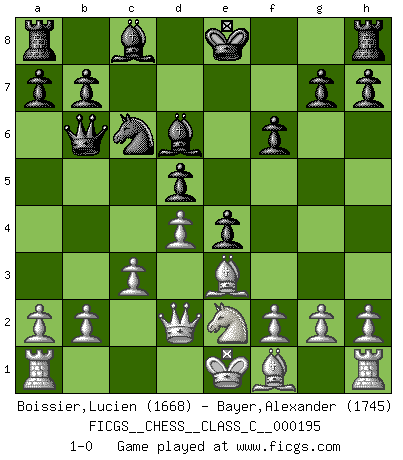 Last move : 1-0 2013 March 12 17:36:0 [Event "FICGS__CHESS__CLASS_C__000195"] [Site "FICGS"] [Date "2012.12.17"] [Round "1"] [White "Boissier,Lucien"] [Black "Bayer,Alexander"] [Result "1-0"] [WhiteElo "1668"] [BlackElo "1745"] 1.d4 d5 2.Nf3 Nf6 3.Bg5 Ne4 4.Bf4 c5 5.e3 Qb6 6.Qc1 Nc6 7.c3 f6 8.Nbd2 cxd4 9.exd4 e5 10.Be3 Nxd2 11.Qxd2 e4 12.Ng1 Bd6 13.Ne2 1-0 Torre attack (Tartakower variation) Player White won this chess game. Follow this game move after move (download)It is always better to sacrifice your opponent's men. (Savielly Tartakower) Meine Liebe ist Schach, Schach, Schach. Ich muss jeden Tag Schach spielen, deshalb fühle ich mich so stark. (Miguel Najdorf) El Ajedrez es el juego mas altamente simbólico, pero las agresiones estan por lo tanto aún mas francamente representadas en la partida. Tal vez comenzo como un juego de guerra; Algo como la representación de una batalla en miniatura entre las fuerzas de dos reinos. (Karl Meninger) Vous savez, camarade Pachman, je n'éprouve pas de plaisir à être ministre, je jouerais plutôt aux échecs comme vous, ou alors ferais une révolution au Venezuela. (Che Guevara à Ludek Pachman, 'Checkmate in Prague', 1975) God, you are such an idiot. - Actually, I thought I was more of a jerk. (Gregory House to Stacy Warner, House M.D.)