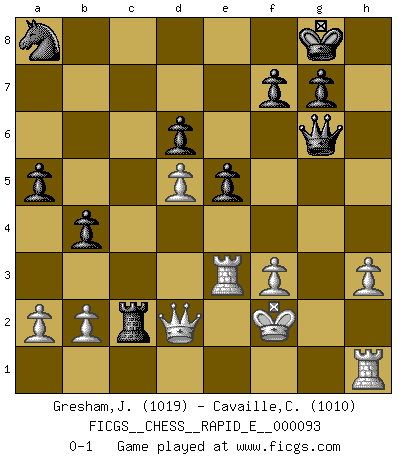Last move : 0-1 2013 January 12 21:40:30 [Event "FICGS__CHESS__RAPID_E__000093"] [Site "FICGS"] [Date "2012.12.22"] [Round "1"] [White "Gresham,Jonathan"] [Black "Cavaille,Cedric"] [Result "0-1"] [WhiteElo "1019"] [BlackElo "1010"] 1.e4 c5 2.Nf3 d6 3.d4 cxd4 4.Nxd4 Nf6 5.Nc3 e6 6.Be3 Be7 7.Qd2 O-O 8.Be2 Nc6 9.O-O Nxd4 10.Bxd4 a6 11.g3 e5 12.Be3 Bh3 13.Rfe1 Bg4 14.f3 Be6 15.Rad1 Qd7 16.g4 b5 17.h3 b4 18.Nd5 Bxd5 19.exd5 a5 20.Bg5 Ne8 21.Bxe7 Qxe7 22.Bb5 Qf6 23.Re3 Nc7 24.Bc6 h5 25.gxh5 Qg5+ 26.Kf2 Qxh5 27.Bxa8 Nxa8 28.Rh1 Rc8 29.Kg3 Qg6+ 30.Kf2 Rxc2 0-1 Sicilian : Scheveningen variation Kingside Castling by player Black (move 7) Kingside Castling by player White (move 9) Player Black won this chess game. Follow this game move after move (download)The older I grow, the more I value Pawns. (Keres) Ich brauche nur einen Blick auf das Schachbrett zu werfen, und weiß schon, was in der Stellung steckt, was geschehen kann und was geschehen wird. Alle übrigen suchen und prüfen, ich aber weiß es! (José Raúl Capablanca) En manos de Fischer's, una diminuta ventaja teórica es tan buena como tener una Reina de ventaja. (Isaac Kashdan) Le jeu d'échecs est comme rejeté hors du temps. (Antoine de Saint-Exupéry) Now the reason the enlightened prince and the wise general conquer the enemy whenever they move and their achievements surpass those of ordinary men is foreknowledge. (Sun Tzu)