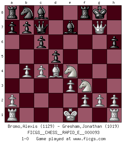 Last move : 1-0 2013 January 2 6:2:5 [Event "FICGS__CHESS__RAPID_E__000093"] [Site "FICGS"] [Date "2012.12.22"] [Round "1"] [White "Bromo,Alexis"] [Black "Gresham,Jonathan"] [Result "1-0"] [WhiteElo "1129"] [BlackElo "1019"] 1.d4 d6 2.c4 e6 3.Nc3 Ne7 4.Nf3 h6 5.b4 c6 6.Bb2 Qc7 7.e3 Neg6 8.Bd3 Be7 9.Qc2 O-O 10.Bxg6 fxg6 11.Qxg6 e5 12.Ne4 exd4 13.Bxd4 d5 14.Qxg7+ 1-0 Old Indian defense Kingside Castling by player Black (move 9) Player White won this chess game. Follow this game move after move (download)Chess is a fairy tale of 1001 blunders. (Savielly Tartakower) Wenn sie aufgeben, dann danke ich Ihnen für das Spiel (Eventualzug beim Fernschach). (Anonymous) El Ajedrez no es como la vida... ¡tiene reglas!. (Mark Pasternak) La conception d'un plan est le processus par lequel un joueur exploite les avantages de sa position tout en s'efforçant d'en réduire au minimum les inconvénients. Afin de garantir le succès, un plan doit toujours se fonder sur un diagnostic objectif des particularités d'une position. La conception d'un plan est d'autant plus difficile que la position est équilibrée, et grandement facilitée lorsqu'il n'existe qu'un seul plan susceptible de répondre aux exigences de la position. (Harry Golombek) I have opinions of my own - strong opinions - but I don't always agree with them. (George Bush)