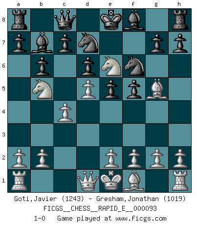Last move : 1-0 2013 January 15 18:52:9 [Event "FICGS__CHESS__RAPID_E__000093"] [Site "FICGS"] [Date "2012.12.22"] [Round "1"] [White "Goti,Javier"] [Black "Gresham,Jonathan"] [Result "1-0"] [WhiteElo "1243"] [BlackElo "1019"] 1.c4 f5 2.Nc3 Nf6 3.Nf3 b6 4.d4 Bb7 5.d5 d6 6.Bg5 Nbd7 7.Nd4 e5 8.Ne6 Qc8 9.Nb5 1-0 English : Anglo-Dutch defense Player White won this chess game. Follow this game move after move (download)In a gambit you give up a Pawn for the sake of getting a lost game. (Samuel Standige Boden) Es macht mich traurig, wenn ich sehe, dass Golfprofis mehr verdienen als Schachsportler. Obwohl ich davon überzeugt bin, dass wir Schachspieler viel härter trainieren müssen als die Golfer. (Alexandra Kosteniuk) Para mi, el Ajedrez es la vida y cada partida es como una nueva vida. Todo jugador de Ajedrez suele vivir muchas vidas durante su vida. (Eduard Gufeld) Demandez au pauvre Cg1 ce qu'il en pense. Eduard Gufeld à propos de la variante Saemisch de l'Est-Indienne. Life is like a play: it's not the length but the excellence of the acting that matters. (Seneca)