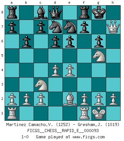 Last move : 1-0 2013 January 12 5:49:50 [Event "FICGS__CHESS__RAPID_E__000093"] [Site "FICGS"] [Date "2012.12.22"] [Round "1"] [White "Martinez Camacho,Victor Hugo"] [Black "Gresham,Jonathan"] [Result "1-0"] [WhiteElo "1252"] [BlackElo "1019"] 1.e4 e6 2.d4 d6 3.Nf3 Ne7 4.Nc3 Nd7 5.Be2 g6 6.Be3 Bg7 7.Qd2 O-O 8.O-O b6 9.Bh6 Bxh6 10.Qxh6 Re8 11.Ng5 Rf8 12.Qxh7+ 1-0 Lengfellner system Kingside Castling by player Black (move 7) Kingside Castling by player White (move 8) Player White won this chess game. Follow this game move after move (download)Chess mastery essentially consists of analyzing Chess positions accurately. (Mikhail Botvinnik) Er war ein guter Schachspieler, aber ich kann Leute nicht ausstehen, die 'Heil Hitler' rufen (Über Alexander Aljechin). (Miguel Najdorf) No hay un Gran Maestro de Ajedrez que sea normal; solo se diferencían ellos por la magnitud de su locura. (Viktor Korchnoi) La guerre est enfant de la passion, la passion est enfant du narcissisme et le narcissisme est l'enfant. (...) Une autre partie ? (Thibault de Vassal) War is the child of passion, passion is the child of narcissism and narcissism is the child. (...) Another game ? (Thibault de Vassal)