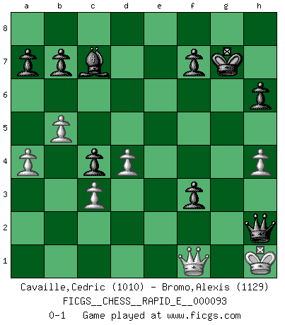 Last move : 0-1 2012 December 22 20:32:44 [Event "FICGS__CHESS__RAPID_E__000093"] [Site "FICGS"] [Date "2012.12.22"] [Round "1"] [White "Cavaille,Cedric"] [Black "Bromo,Alexis"] [Result "0-1"] [WhiteElo "1010"] [BlackElo "1129"] 1.d4 d5 2.Nc3 Nf6 3.Nf3 Nc6 4.Bg5 h6 5.Bxf6 exf6 6.e4 Bb4 7.Qd3 O-O 8.a3 Ba5 9.b4 Bb6 10.exd5 Re8+ 11.Be2 Ne7 12.b5 Bf5 13.Qd2 Nxd5 14.Nxd5 Qxd5 15.O-O Rad8 16.c3 c5 17.Bd3 Bxd3 18.Qxd3 c4 19.Qb1 Ba5 20.Qb2 g5 21.a4 Bc7 22.Nd2 Qd6 23.Nf3 g4 24.g3 gxf3 25.Rfe1 Kg7 26.Rxe8 Rxe8 27.Qa2 Qe6 28.Qb1 Qh3 29.Qf1 Qg4 30.h4 Re2 31.Re1 Rxe1 32.Qxe1 f5 33.Kh2 f4 34.Qf1 fxg3+ 35.fxg3 Qxg3+ 36.Kh1 Qh2+ 0-1 Queen's pawn : Chigorin variation Kingside Castling by player Black (move 7) Kingside Castling by player White (move 15) Player Black won this chess game. Follow this game move after move (download)I'm not afraid of Spassky. The world knows I'm the best. You don't need a match to prove it. (Bobby Fischer) Zeige mir drei Eröffnungsvarianten und ich beweise dir, dass zwei davon inkorrekt sind. (Emanuel Lasker) Después de una mala apertura, hay una esperanza en el juego medio. Pero una vez que estas en finales, el momento de la verdad ha llegado. (Edmar Mednis) La vie et les Echecs sont tous les deux une lutte constante. (Lasker) The Internet is so big, so powerful and pointless that for some people it is a complete substitute for life. (Andrew Brown)