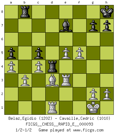 Last move : 1/2-1/2 2013 January 10 20:55:28 [Event "FICGS__CHESS__RAPID_E__000093"] [Site "FICGS"] [Date "2012.12.22"] [Round "1"] [White "Belaz,Egidio"] [Black "Cavaille,Cedric"] [Result "1/2-1/2"] [WhiteElo "1202"] [BlackElo "1010"] 1.e4 e5 2.Nf3 Nc6 3.Bc4 Nf6 4.Nc3 d6 5.Ng5 Be6 6.Nxe6 fxe6 7.Bxe6 Nd4 8.Bd5 Qd7 9.Bxb7 Rb8 10.Ba6 Be7 11.Bd3 O-O 12.O-O d5 13.exd5 Nxd5 14.Ne4 Nb4 15.Bc4+ Nd5 16.c3 Ne6 17.b3 Nc5 18.d4 Nxe4 19.dxe5 c6 20.Qd3 Ng5 21.f4 Nf7 22.Re1 Nd8 23.Bxd5+ Kh8 24.Be4 Qxd3 25.Bxd3 c5 26.c4 Nc6 27.f5 Nd4 28.Rb1 a5 29.Bb2 Rfd8 30.Bxd4 Rxd4 31.Rbd1 Rbd8 32.Re3 Ra8 33.a4 Rb8 34.Rb1 Rbd8 35.Rd1 Rb8 36.Rb1 Rbd8 37.Rd1 Rb8 1/2-1/2 Two knights defense Kingside Castling by player Black (move 11) Kingside Castling by player White (move 12) This chess game ended in a draw. Follow this game move after move (download)My God, Bobby Fischer plays so simply. (Alexei Suetin) Ich habe kein Problem mit Frauen, sondern nur mit dem Niveau ihres Schachspiels (Judith Polgar) En el tablero, la mentira e hipocresía no sobreviven mucho. (Emanuel Lasker) Donnez-moi un Cavalier en 6e et je gagnerais toutes mes parties. (Steinitz) There are more things in heaven and earth than practically anywhere else. (Unknown)