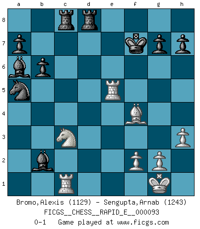 Last move : 0-1 2012 December 23 8:23:55 [Event "FICGS__CHESS__RAPID_E__000093"] [Site "FICGS"] [Date "2012.12.22"] [Round "1"] [White "Bromo,Alexis"] [Black "Sengupta,Arnab"] [Result "0-1"] [WhiteElo "1129"] [BlackElo "1243"] 1.d4 d5 2.c4 Nf6 3.Nc3 dxc4 4.e3 e6 5.Bxc4 c5 6.Nf3 cxd4 7.Nxd4 e5 8.Nde2 Qxd1+ 9.Nxd1 Bb4+ 10.Ndc3 O-O 11.a3 Be7 12.e4 Nc6 13.Be3 Rd8 14.h3 Na5 15.Ba2 b6 16.O-O Ba6 17.Rac1 Nxe4 18.Rfe1 Nxc3 19.Nxc3 Rac8 20.Bf4 Bxa3 21.Rxe5 Bxb2 22.Bxf7+ Kxf7 0-1 QGD : Marshall defense Kingside Castling by player Black (move 10) Kingside Castling by player White (move 16) Player Black won this chess game. Follow this game move after move (download)By the beauty of his games, the clarity of his play, and the brilliance of his ideas, Fischer made himself an artist of the same stature as Brahms, Rembrandt, and Shakespeare. (David Levy) Wer mein Gambit spielt, muß bereit sein, alle Brücken hinter sich abzubrechen. Es verändert den ganzen Menschen. Es wirkt wie ein Zauberstab und fördert verkümmerte, gute Charakter- eigenschaften wieder zu Tage. (Emil Joseph Diemer) Yo siempre he tenido un ligero sentimiento de lástima por una persona que no tiene conocimiento del Ajedrez. (Siegbert Tarrasch) Je crois qu'il existe des manières très spécifiques de jouer efficacement contre une machine. Evidemment, nous n'avons aucune chance en technique pure, parce que l'ordinateur calcule de manière parfaite. Mais lorsque nous faisons appel à notre cerveau, en utilisant l'intuition et la compréhension, alors nous restons beaucoup plus forts. (Anatoli Karpov) My poor ole parrot... Is not in the circulation of displays ....poo hoo hoo :) (Wayne Lowrance's enigma)