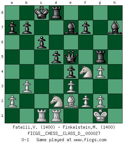 Last move : 0-1 2007 May 16 9:25:33 [Event "FICGS__CHESS__CLASS_D__000027"] [Site "FICGS"] [Date "2007.01.21"] [Round "1"] [White "Fatelli,Vittorio"] [Black "Finkelstein,Michael"] [Result "0-1"] [WhiteElo "1400"] [BlackElo "1400"] 1.d4 d5 2.Bg5 c6 3.e3 Qb6 4.b3 Nf6 5.Bxf6 gxf6 6.c3 e5 7.dxe5 fxe5 8.Qh5 Qc7 9.Bd3 e4 10.Be2 Nd7 11.Nd2 Rg8 12.Nh3 Nf6 13.Qh4 Qe5 14.O-O Be7 15.Nf4 Ng4 16.Qh5 Rg5 17.Qxh7 Bf5 18.h3 Bxh7 19.hxg4 Qxc3 20.Rfd1 O-O-O 21.Rac1 Qe5 0-1 Levitsky attack (Queen's Bishop attack) Kingside Castling by player White (move 14) Queenside Castling by player Black (move 20) Player Black won this chess game. Follow this game move after move (download)The hardest game to win is a won game. (Emanuel Lasker) Ich moechte nie einem Club beitreten, der Leute wie mich als Mitglieder aufnimmt. (Woody Allen) La maestría del Ajedrez consiste esencialmente en analizar posiciónes de Ajedrez con precisión. (Mikhail Botvinnik) Les échecs sont un jeu terrible. Si vous n'avez pas le centre, votre adversaire a une position plus libre. Par contre, si vous avez le centre, alors vous avez vraiment quelque chose pour laquelle vous inquiéter ! (Siegbert Tarrasch) A married woman is like a fish riding a bicycle. (Rodolfo d'Ettorre)