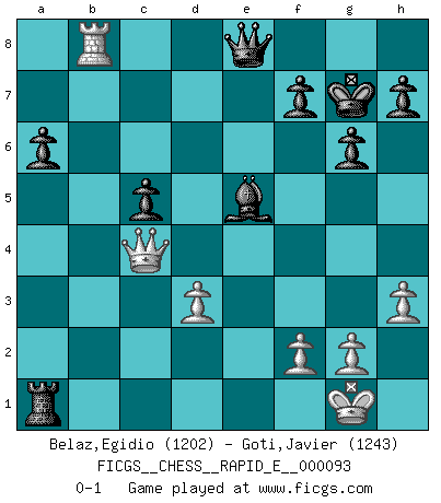 Last move : 0-1 2013 February 24 13:15:23 [Event "FICGS__CHESS__RAPID_E__000093"] [Site "FICGS"] [Date "2012.12.22"] [Round "1"] [White "Belaz,Egidio"] [Black "Goti,Javier"] [Result "0-1"] [WhiteElo "1202"] [BlackElo "1243"] 1.e4 c5 2.Bc4 e6 3.Nf3 g6 4.Na3 Bg7 5.c3 Ne7 6.O-O O-O 7.d3 d5 8.exd5 exd5 9.Bb3 a6 10.Be3 Bg4 11.Qe2 b6 12.Bd1 Nbc6 13.Qd2 Nf5 14.h3 Nxe3 15.Qxe3 Bxf3 16.Bxf3 Re8 17.Qd2 b5 18.c4 Ne5 19.Bxd5 Rb8 20.Rae1 bxc4 21.Bxc4 Rxb2 22.Qf4 Nxc4 23.Rxe8+ Qxe8 24.Nxc4 Rxa2 25.Nd6 Qe6 26.Rb1 Be5 27.Rb8+ Kg7 28.Ne8+ Qxe8 29.Qc4 Ra1+ 0-1 Sicilian defense Kingside Castling by player White (move 6) Kingside Castling by player Black (move 6) Player Black won this chess game. Follow this game move after move (download)The way he plays Chess demonstrates a man's whole nature. (Stanley Ellin) Schach ist eine Sache der genauen Beurteilung, wann man zuschlagen und wann man sich ducken muss. (Robert James Fischer) El jugador de combinación piensa hacia adelante; comienza de la posición dada y trabaja las movidas contundentes en su mente. (Emanuel Lasker) Comme les marins qui ont mille raisons différentes d'aller en mer, les joueurs d'échecs en ont tout autant avant de s'installer devant une table et jouer... (Vincent Bertignac, philosophe) The only thing that matters is the evidence. (Horatio Caine, C.S.I. Miami)