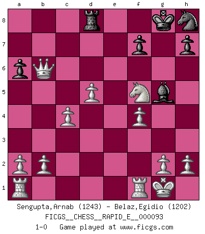 Last move : 1-0 2013 January 10 16:52:47 [Event "FICGS__CHESS__RAPID_E__000093"] [Site "FICGS"] [Date "2012.12.22"] [Round "1"] [White "Sengupta,Arnab"] [Black "Belaz,Egidio"] [Result "1-0"] [WhiteElo "1243"] [BlackElo "1202"] 1.e4 c5 2.Nf3 Nc6 3.d4 cxd4 4.Nxd4 Ne5 5.Nc3 e6 6.Bf4 Ng6 7.Bg3 d6 8.Bb5+ Bd7 9.O-O Be7 10.Bxd7+ Qxd7 11.Ndb5 e5 12.Nd5 Bd8 13.c4 a6 14.Qa4 N8e7 15.Nxd6+ Kf8 16.Qxd7 Ba5 17.Qxb7 Rd8 18.Bxe5 Bd2 19.Nf5 Nxd5 20.Bxg7+ Kg8 21.exd5 Bf4 22.Bxh8 Nxh8 23.Qb6 Bg5 24.f4 1-0 Sicilian defense Kingside Castling by player White (move 9) Player White won this chess game. Follow this game move after move (download)Look at Garry Kasparov. After he loses, invariably he wins the next game. He just kills the next guy. That's something that we have to learn to be able to do. (Maurice Ashley) Du weisst es gibt ein Problem mit Computern und Fernschach, wenn jeder eine Rating von 2450 hat. (John Christen Knudsen) La pasion por jugar al Ajedrez es una de las mas inexplicables en el mundo. (H.G. Wells) Horreur, mais aussi harmonie suprême : qu'y avait-il en effet au monde en dehors des échecs ? Le brouillard, l'inconnu, le non-être... (Vladimir Nabokov) Employ the attack like tactic of defense. (Chinese proverb)