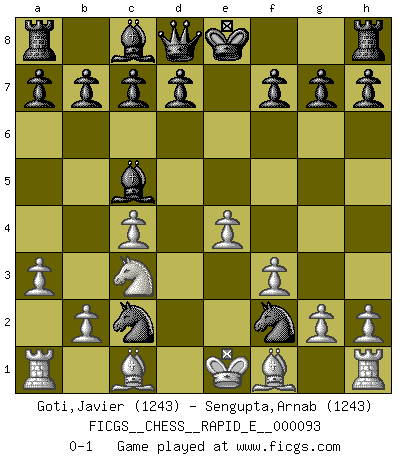 Last move : 0-1 2012 December 30 11:26:10 [Event "FICGS__CHESS__RAPID_E__000093"] [Site "FICGS"] [Date "2012.12.22"] [Round "1"] [White "Goti,Javier"] [Black "Sengupta,Arnab"] [Result "0-1"] [WhiteElo "1243"] [BlackElo "1243"] 1.c4 Nf6 2.Nc3 e5 3.e4 Bc5 4.Nf3 Nc6 5.a3 Ng4 6.d4 exd4 7.Nxd4 Nxd4 8.f3 Nf2 9.Qc2 Nxc2+ 0-1 English Opening Player Black won this chess game. Follow this game move after move (download)Who is your opponent tonight, tonight I am playing against the Black pieces. (Akiba Rubinstein) Unter Putin wird alles Geld aus Russland wie von einem Staubsauger nach Moskau umgeleitet, das ist wie ein schwarzes Loch. (Garry Kasparov) El Peón aislado arroja penumbra sobre todo el tablero. (Aaron Nimzovich) Avec des compensations pour le matériel en plus... (Anonyme) Control your own destiny or someone else will. (Jack Welch)