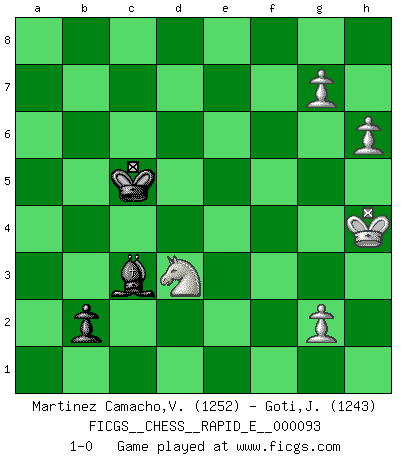 Last move : 1-0 2013 April 26 23:31:52 [Event "FICGS__CHESS__RAPID_E__000093"] [Site "FICGS"] [Date "2012.12.22"] [Round "1"] [White "Martinez Camacho,Victor Hugo"] [Black "Goti,Javier"] [Result "1-0"] [WhiteElo "1252"] [BlackElo "1243"] 1.d4 g6 2.e4 d6 3.Nc3 Bg7 4.Nf3 Nf6 5.Bc4 O-O 6.O-O e5 7.dxe5 dxe5 8.Nxe5 Be6 9.Bb3 Nbd7 10.Nxd7 Nxd7 11.Bf4 Bxb3 12.axb3 c6 13.Re1 Re8 14.Kh1 f6 15.f3 b5 16.b4 f5 17.exf5 Ne5 18.Qxd8 Raxd8 19.fxg6 hxg6 20.Rxa7 Nf7 21.Rxe8+ Rxe8 22.h3 Ne5 23.Ne4 Nf7 24.c3 Kf8 25.Nc5 g5 26.Bg3 Re2 27.Ra8+ Ke7 28.Ra7+ Kf6 29.Ra6 Nd8 30.Nd7+ Ke6 31.Nc5+ Kd5 32.Ra8 Bf6 33.Bc7 Re1+ 34.Kh2 Nf7 35.Ne4 Bg7 36.Rg8 Bh6 37.b3 Ke6 38.Nc5+ Kf6 39.Ne4+ Ke7 40.Bg3 Rb1 41.Nc5 g4 42.fxg4 Kf6 43.Rc8 Ne5 44.Bxe5+ Kxe5 45.Rxc6 Be3 46.Nd7+ Kd5 47.Rg6 Rxb3 48.h4 Rxc3 49.h5 Rc6 50.Nf8 Rxg6 51.Nxg6 Bd2 52.Kh3 Kc4 53.Kh4 Kxb4 54.g5 Bc3 55.Nf4 Kc5 56.h6 b4 57.g6 b3 58.g7 b2 59.Nd3+ 1-0 Modern defense Kingside Castling by player Black (move 5) Kingside Castling by player White (move 6) 10 pieces endgame at move 50 : White KNPPPP , Black KRBP WHITE : King + 1 Knight 4 Pawns BLACK : King + 1 Rook 1 Bishop 1 Pawn 9 pieces endgame at move 51 : White KNPPPP , Black KBP WHITE : King + 1 Knight 4 Pawns BLACK : King + 1 Bishop 1 Pawn 8 pieces endgame at move 53 : White KNPPP , Black KBP WHITE : King + 1 Knight 3 Pawns BLACK : King + 1 Bishop 1 Pawn Player White won this chess game. Follow this game move after move (download)All I want to do, ever, is just play Chess. (Bobby Fischer) Man wirke der falschen Auffassung entgegen, als ob jeder Zug Unmittelbares zu leisten habe; auch Werte- und Ruhezüge haben ihre Existenzberechtigung. (Aaron Nimzowitsch) El Ajedrez es sobre todo, ¡una pelea!. (Emanuel Lasker) Roi des jeux et jeu des rois, les échecs portent en eux un sentiment d'infini. Ils donnent à celui qui s'est efforcé d'en approfondir les arcanes l'impression de n'être pas à la mesure de l'homme; en fait, ils constituent un résumé de l'univers, un microcosme, et figurent cette grande échelle qui, dans les plans de la lumière descend jusqu'à la matière, qui des abîmes insondables remonte jusqu'en l'infini de Dieu. (Pyrame) A good programmer is someone who always looks both ways before crossing a one-way street. (Doug Linder)
