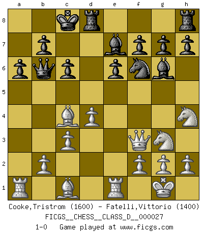 Last move : 1-0 2007 May 17 3:38:2 [Event "FICGS__CHESS__CLASS_D__000027"] [Site "FICGS"] [Date "2007.01.21"] [Round "1"] [White "Cooke,Tristrom"] [Black "Fatelli,Vittorio"] [Result "1-0"] [WhiteElo "1600"] [BlackElo "1400"] 1.e4 c6 2.d4 d5 3.Nc3 dxe4 4.Nxe4 Bf5 5.Ng3 Bg6 6.Nf3 Nd7 7.Bc4 e6 8.O-O Ngf6 9.a4 Be7 10.Nh4 Qc7 11.a5 a6 12.Re1 O-O-O 13.c3 Nb6 14.axb6 Qxb6 15.Qf3 1-0 This chess game has been lost on time (started : 2007.01.21 2:7:59) Caro-Kann : Classical variation Kingside Castling by player White (move 8) Queenside Castling by player Black (move 12) Player White won this chess game. Follow this game move after move (download)Chess is mental torture. (Garry Kasparov) Spielt Blackmar-Diemer-Gambit, und das Matt kommt von selbst! (Emil Joseph Diemer) Hasta este punto, las blancas han seguido un análisis bien conocido. Pero ahora el hace un error fatal: empieza a usar su propia cabeza. (Siegbert Tarrasch) Il n'y a pas eu de défaite parce que je ne crois pas que cet ordinateur ait jamais existé. IBM a triché en refusant d'imprimer les modes de recherche de la machine. C'est évident, pendant le match, des coups décisifs ont été joués par des êtres humains. Aujourd'hui, les meilleurs spécialistes en informatique ne peuvent toujours pas expliquer comment Deep-Blue a pu jouer contre la logique des ordinateurs. IBM a gagné une guerre de communication, mais ils sont incapables de prouver que l'ordinateur a gagné tout seul. (Garry Kasparov) They say poker is a zero-sum game. It must be, because every time I play my sum ends up zero. (Max Shapiro)