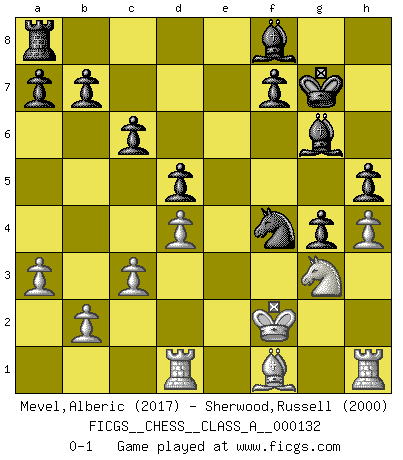 Last move : 0-1 2013 February 17 12:58:41 [Event "FICGS__CHESS__CLASS_A__000132"] [Site "FICGS"] [Date "2012.12.22"] [Round "1"] [White "Mevel,Alberic"] [Black "Sherwood,Russell"] [Result "0-1"] [WhiteElo "2017"] [BlackElo "2000"] 1.e4 e5 2.f4 exf4 3.Nf3 g5 4.h4 g4 5.Ne5 Nf6 6.d4 d6 7.Nd3 Nxe4 8.Bxf4 Bg7 9.c3 O-O 10.Nd2 Re8 11.Nxe4 Rxe4+ 12.Be2 Nc6 13.Kf1 Qf6 14.g3 Ne7 15.Qd2 Ng6 16.Nf2 Rxf4 17.gxf4 h5 18.Ne4 Qxf4+ 19.Qxf4 Nxf4 20.Bb5 Bf5 21.Ng3 Bg6 22.Kf2 c6 23.Bf1 d5 24.Rd1 Bf8 25.a3 Kg7 0-1 KGA : Kieseritsky, Berlin defense Kingside Castling by player Black (move 9) Player Black won this chess game. Follow this game move after move (download)Chess is the art of analysis. (Mikhail Botvinnik) Sitze auf Deine Hände. (Siegbert Tarrasch) Un Peón pasado aumenta su poder a medida de que el número de piezas en el tablero disminuye. (Capablanca) Toutes les manuvres exécutées sur une colonne ouverte ont pour but ultime l'intrusion définitive sur la septième ou la huitième rangée, en plein cur de la position ennemie. (Aaron Nimzovitch) Bobby never cared about money, though. His only desire was to prove that his choices were correct: He wanted chess to be important because he was a chess player, and he wanted to be important. Bobby knew money was important, but he didn't have a clue why, outside of clothes and status. The only way he could accomplish what he wanted was to fight for a lot of money. Once he got it, he gave it away. He did not know how to spend it. And once he'd become champion, after, essentially, sacrificing his life for it, he didn't know how to spend his time. (Bob Wade)