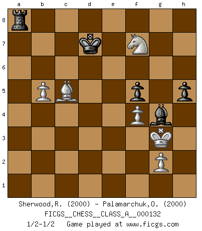 Last move : 1/2-1/2 2013 January 21 15:17:55 [Event "FICGS__CHESS__CLASS_A__000132"] [Site "FICGS"] [Date "2012.12.22"] [Round "1"] [White "Sherwood,Russell"] [Black "Palamarchuk,Oleg"] [Result "1/2-1/2"] [WhiteElo "2000"] [BlackElo "2000"] 1.e4 e5 2.Nf3 Nc6 3.Bb5 a6 4.Ba4 b5 5.Bb3 Bb7 6.d4 exd4 7.O-O Be7 8.c3 Na5 9.Bc2 dxc3 10.Nxc3 d6 11.Qe2 Nf6 12.Rd1 Nd7 13.Nd5 O-O 14.a4 Nc5 15.axb5 Nab3 16.Bxb3 Nxb3 17.Nxe7+ Qxe7 18.bxa6 Qxe4 19.Qxe4 Bxe4 20.Ra3 Bc2 21.Re1 f6 22.Nd2 Nc5 23.a7 Nd3 24.Rf1 Nb4 25.Nf3 c5 26.Bd2 Rf7 27.Rfa1 Nc6 28.Bf4 Rd7 29.h4 h6 30.Kh2 g5 31.Bg3 Nb4 32.Nd2 Bd3 33.f4 gxh4 34.Bxh4 f5 35.Bf2 Kf7 36.Ra4 Nc2 37.Rd1 Bb5 38.Ra5 Be2 39.Rc1 Nb4 40.Re1 Bd3 41.Rea1 Rb7 42.R1a3 Re7 43.Bh4 Rd7 44.Bf2 Be2 45.Nb3 Nd3 46.Bd4 Rb7 47.Bg1 Ke6 48.Be3 Bg4 49.Ra6 Kd7 50.Nd2 Nb4 51.Nc4 Nxa6 52.Rxa6 Kc7 53.Nxd6 Rb6 54.Rxb6 Kxb6 55.b4 Kxa7 56.Bxc5+ Kb8 57.Nf7 h5 58.Kg3 Kc7 59.b5 Kd7 1/2-1/2 Ruy Lopez : Caro variation Kingside Castling by player White (move 7) Kingside Castling by player Black (move 13) This chess game ended in a draw. Follow this game move after move (download)We don't really know how the game was invented, though there are suspicions. As soon as we discover the culprits, we'll let you know. (Bruce Pandolfini) Ich verstehe mehr vom Schach als irgendein anderer lebender Meister. (José Raúl Capablanca) Aún deseo matar a Fischer. (Boris Spassky) Dans le domaine de la peinture, de la gravure et de la sculpture, dès la première décennie de notre siècle, les artistes abandonnent la représentation de la partie d'échecs pour se concentrer sur les pièces, sur les échiquiers et sur toutes les variations auxquelles les unes et les autres peuvent donner lieu. On passe en quelque sorte d'un thème social à un thème musical (au sens de la musica médiévale, c'est-à-dire d'une notion qui inclue le rythme, l'harmonie, la construction et la déconstruction, etc.). Graphiquement et picturalement, l'échiquier apparaît comme une structure ouverte, dynamique, d'une richesse infinie, autorisant toutes les combinatoires et débouchant sur des mouvements et des rythmes de nature exponentielle. (Michel Pastoureau) Experience is the name we all give to our mistakes. (Oscar Wilde)