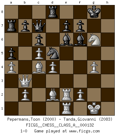 Last move : 1-0 2013 April 25 13:7:30 [Event "FICGS__CHESS__CLASS_A__000132"] [Site "FICGS"] [Date "2012.12.22"] [Round "1"] [White "Pepermans,Toon"] [Black "Tanda,Giovanni"] [Result "1-0"] [WhiteElo "2000"] [BlackElo "2083"] 1.d4 d5 2.c4 c6 3.Nf3 Nf6 4.Nc3 a6 5.c5 Nbd7 6.Bf4 Nh5 7.Bd2 g6 8.e4 dxe4 9.Nxe4 Ndf6 10.Nxf6+ Nxf6 11.Bc4 Bg7 12.Qb3 O-O 13.O-O Nd5 14.Rfe1 a5 15.a4 Ra7 16.Ne5 Be6 17.Re2 Qc7 18.h4 Rd8 19.Rae1 Bf6 20.h5 Bf5 21.g4 Be6 22.hxg6 hxg6 23.Nxg6 1-0 QGD Slav : 4.Nc3 Kingside Castling by player Black (move 12) Kingside Castling by player White (move 13) Player White won this chess game. Follow this game move after move (download)A win by an unsound combination, however showy, fills me with artistic horror. (Wilhelm Steinitz) Sehr viele beherrschen heutzutage das große Einmalseins des Schachspiels und kennen sogar dessen Logarithmentafeln auswendig - deshalb sollte man hin und wieder zu beweisen trachten, dass zwei mal zwei auch fünf sein kann. (Mikhail Nekhemyevich Tal) Si un gobernante no entiende al Ajedrez, ¿como puede governar él un reinado?. (El Rey Khusros II) Je crois qu'il existe des manières très spécifiques de jouer efficacement contre une machine. Evidemment, nous n'avons aucune chance en technique pure, parce que l'ordinateur calcule de manière parfaite. Mais lorsque nous faisons appel à notre cerveau, en utilisant l'intuition et la compréhension, alors nous restons beaucoup plus forts. (Anatoli Karpov) Pushing plastic is for the many, pushing virtual pieces is for the fewer, pushing wood is for the very few. (Normajean Yates)
