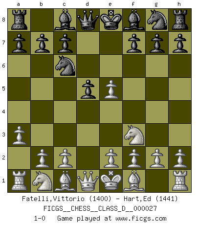 Last move : 1-0 2007 March 4 6:27:30 [Event "FICGS__CHESS__CLASS_D__000027"] [Site "FICGS"] [Date "2007.01.21"] [Round "1"] [White "Fatelli,Vittorio"] [Black "Hart,Ed"] [Result "1-0"] [WhiteElo "1400"] [BlackElo "1441"] 1.d4 d5 2.Nf3 Nc6 3.a3 e5 4.dxe5 1-0 This chess game has been lost on time (started : 2007.01.21 2:7:59) Queen's pawn game, Chigorin variation Player White won this chess game. Follow this game move after move (download)It is peculiar but a fact nevertheless, that gamblers in chess always have enthusiastic followers. (Botvinnik) Ich habe kein Problem mit Frauen, sondern nur mit dem Niveau ihres Schachspiels (Judith Polgar) El Ajedrez es una guerra en un tablero. El objetivo es aplastar la mente del oponente. (Bobby Fischer) Mon pion favori sur ma case favorite ! Bronstein en parlant d'un coup de pion en h5 quand il avait les Noirs. A journey of a thousand sites begins with a single click. (Author unknown)