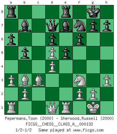 Last move : 1/2-1/2 2013 February 20 2:6:55 [Event "FICGS__CHESS__CLASS_A__000132"] [Site "FICGS"] [Date "2012.12.22"] [Round "1"] [White "Pepermans,Toon"] [Black "Sherwood,Russell"] [Result "1/2-1/2"] [WhiteElo "2000"] [BlackElo "2000"] 1.e4 e5 2.Nf3 Nc6 3.Bb5 a6 4.Ba4 Nf6 5.O-O Be7 6.Re1 b5 7.Bb3 O-O 8.h3 Bb7 9.d3 d6 10.a3 Qd7 11.Nc3 Rfe8 12.Bd2 Nd8 13.Nd5 Nxd5 14.exd5 c6 15.c4 cxd5 16.cxd5 f6 17.d4 Nf7 18.Bc3 1/2-1/2 Ruy Lopez : Closed, 7...O-O Kingside Castling by player White (move 5) Kingside Castling by player Black (move 7) This chess game ended in a draw. Follow this game move after move (download)A passed Pawn increases in strength as the number of pieces on the board diminishes. (Capablanca) Herr Iljumschinow ist ein etwas merkwürdiger Geschäftsmann: Er arbeitet zusammen mit Leuten wie Muammar al-Gaddafi; früher ist das Saddam Hussein gewesen. (Joel Lautier) La belleza de un movimiento no se refleja solo en su apariencia, sino en el pensamiento detrás de él. (Siegbert Tarrasch) Roi des jeux et jeu des rois, les échecs portent en eux un sentiment d'infini. Ils donnent à celui qui s'est efforcé d'en approfondir les arcanes l'impression de n'être pas à la mesure de l'homme; en fait, ils constituent un résumé de l'univers, un microcosme, et figurent cette grande échelle qui, dans les plans de la lumière descend jusqu'à la matière, qui des abîmes insondables remonte jusqu'en l'infini de Dieu. (Pyrame) Unless I accept my faults I will most certainly doubt my virtues. (Hugh Prather)