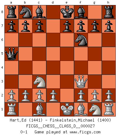 Last move : 0-1 2007 March 3 0:19:23 [Event "FICGS__CHESS__CLASS_D__000027"] [Site "FICGS"] [Date "2007.01.21"] [Round "1"] [White "Hart,Ed"] [Black "Finkelstein,Michael"] [Result "0-1"] [WhiteElo "1441"] [BlackElo "1400"] 1.e4 d5 2.exd5 Qxd5 3.Qf3 Nf6 4.Nc3 Qa5 0-1 This chess game has been lost on time (started : 2007.01.21 2:7:59) Scandinavian (centre counter) defense Player Black won this chess game. Follow this game move after move (download)Mistrust is the most necessary characteristic of the Chess player. (Siegbert Tarrasch) Über die Verhaftung Bobby Fischers: Warum es die Bush-Administration für nötig befindet einen 61 Jahre alten Mann zu hetzten, der für niemanden ausser sich selbste eine Gefahr darstellt ist ein Rätsel. (Nigel Short) Los Peones son nacidos libres, y aún así, se encuentran por doquier encadenados. (Rick Kennedy) Tout change constamment, y compris dans le monde des Echecs. (Botvinnik) The ultimate in disposing one's troops is to be without ascertainable shape. Then the most penetrating spies cannot pry in nor can the wise lay plans against you. (Sun Tzu)