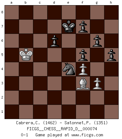 Last move : 0-1 2013 March 20 23:15:55 [Event "FICGS__CHESS__RAPID_D__000074"] [Site "FICGS"] [Date "2012.12.25"] [Round "1"] [White "Cabrera,Claudio"] [Black "Satonnet,Patrick"] [Result "0-1"] [WhiteElo "1462"] [BlackElo "1351"] 1.Nf3 c5 2.c4 g6 3.Nc3 Bg7 4.d4 cxd4 5.Nxd4 Nc6 6.Nb3 a5 7.g3 a4 8.Nc5 a3 9.Bg2 axb2 10.Bxb2 d6 11.Nd3 Nf6 12.Nd5 O-O 13.Nxf6+ Bxf6 14.Bxf6 Qa5+ 15.Qd2 exf6 16.Qxa5 Nxa5 17.c5 Nb3 18.Rb1 Nxc5 19.Nb4 Be6 20.Rb2 Kg7 21.O-O Na4 22.Rc2 Rac8 23.Rfc1 Rc5 24.Nd3 Rxc2 25.Rxc2 Rc8 26.Rxc8 Bxc8 27.Nb4 b6 28.Bd5 Be6 29.Bc6 Nc3 30.a3 Nxe2+ 31.Kf1 Nd4 32.Bd5 Nb5 33.a4 Nc3 34.Bc6 Bb3 35.f4 Nxa4 36.Nd5 Bxd5 37.Bxd5 f5 38.Kf2 Nc3 39.Bb3 Kf6 40.Ke3 h6 41.Kd4 Ne4 42.Bd5 Ke7 43.Kc4 Nd2+ 44.Kb5 Nf1 45.Kxb6 Nxh2 46.Bg2 Ng4 47.Kc6 h5 48.Bf3 Nf6 49.Kb5 Ne4 0-1 Reti Opening Kingside Castling by player Black (move 12) Kingside Castling by player White (move 21) Player Black won this chess game. Follow this game move after move (download)The winner of the game is the player who makes the next-to-last mistake. (Savielly Tartakover) Ich las kürzlich ein Buch von Nietzsche. Er sagte Religion verdumme nur die Menschen. Ich stimme zu. (Robert James Fischer) Nos gusta pensar. (Gary Kasparov) Les Cavaliers se révèlent fort utiles dans les positions fermées. D'habitude, les Fous sont un peu plus forts que les Cavaliers dans les positions ouvertes. Qu'on le veuille ou non, il restera toujours des exceptions ! The worth of a book is to be measured by what you can carry away from it. (James Bryce)