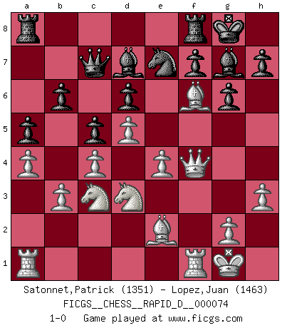 Last move : 1-0 2013 January 16 23:50:19 [Event "FICGS__CHESS__RAPID_D__000074"] [Site "FICGS"] [Date "2012.12.25"] [Round "1"] [White "Satonnet,Patrick"] [Black "Lopez,Juan"] [Result "1-0"] [WhiteElo "1351"] [BlackElo "1463"] 1.d4 Nf6 2.c4 g6 3.Nc3 Bg7 4.e4 d6 5.Nf3 Nbd7 6.Be2 c6 7.O-O O-O 8.Be3 e5 9.d5 c5 10.Ne1 Nb6 11.h3 Bd7 12.a4 a5 13.b3 Nc8 14.Qd2 b6 15.Bg5 Ne7 16.Nd3 Qc8 17.f4 exf4 18.Qxf4 Qc7 19.Bxf6 1-0 King's Indian : 5.Nf3 Kingside Castling by player White (move 7) Kingside Castling by player Black (move 7) Player White won this chess game. Follow this game move after move (download)Winning isn't everything... but losing is nothing. (Mednis) Das ganze Leben mit einer Ehefrau ist wie ein Endspiel mit ungleichfarbigen Läufern. (Viktor Kortschnoi) Tu no necesitas jugar muy bien, únicamente ayudar a tu oponenet a que juegue muy mal. (Genrikh Chepukaitis) Il (Jacob Murray) ne joue pas pour le bon coup, mais pour le meilleur. (Eloi Relange) Control your own destiny or someone else will. (Jack Welch)